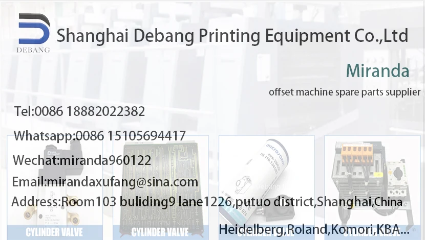 Шанхай Debang полиграфическое оборудование обратную связь о том, что вы хотите, Ltd. является долгосрочной перспективе поставщиком для нанесения печати по фольге части решений с 20-летним стажем. Мы можем предоставить оригинальные детали для наших клиентов, оригинальные разобранные второй части, оригинальные импортные запасные части и китайские соответствующие части. Наша компания поставляет большое количество товаров. Одна из крупнейших и наиболее полных компаний оборудования в Китае.