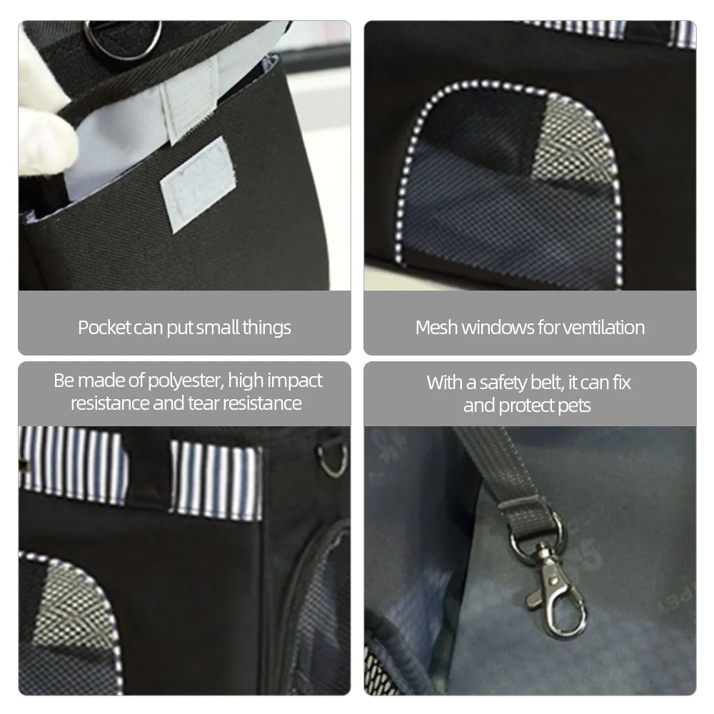С ремнем безопасности, он может зафиксировать и защитить домашних животных. Переноска для домашних животных подходит для маленьких, средних кошек и собак.