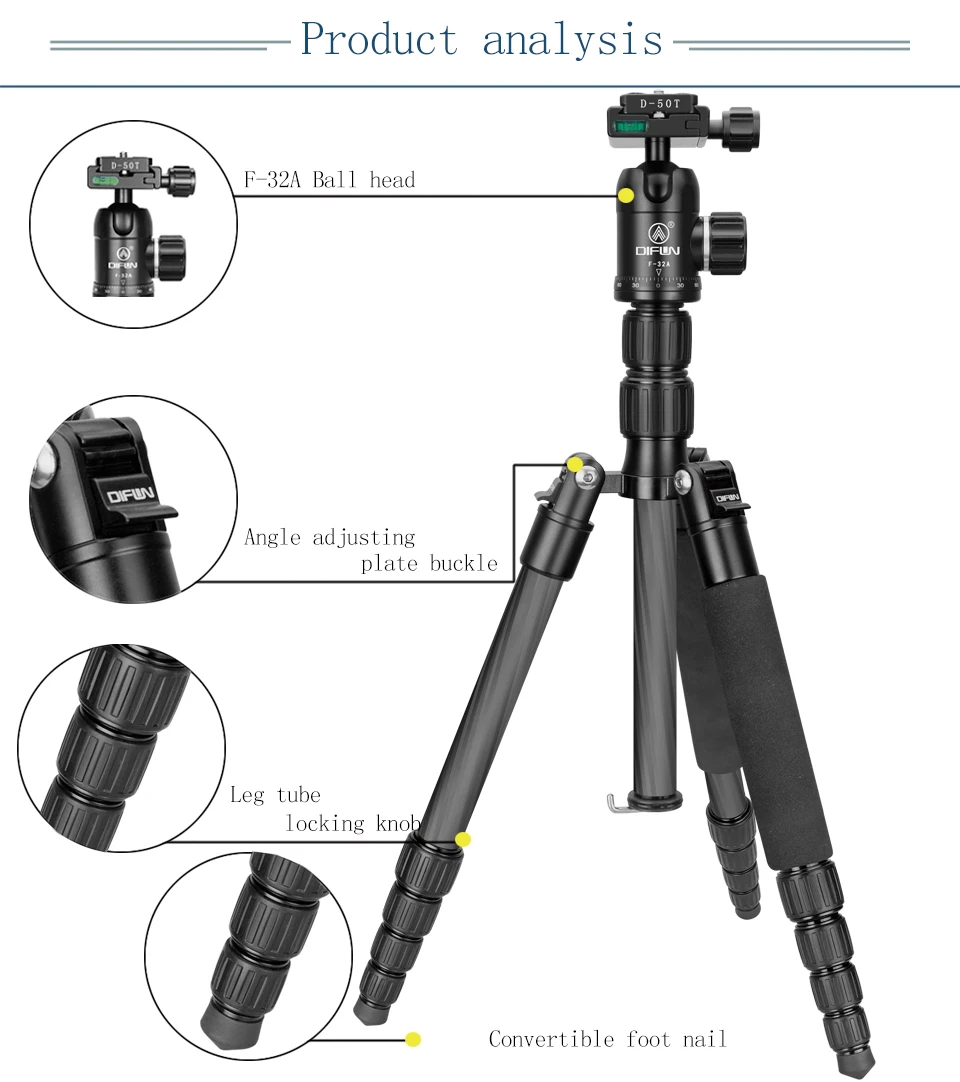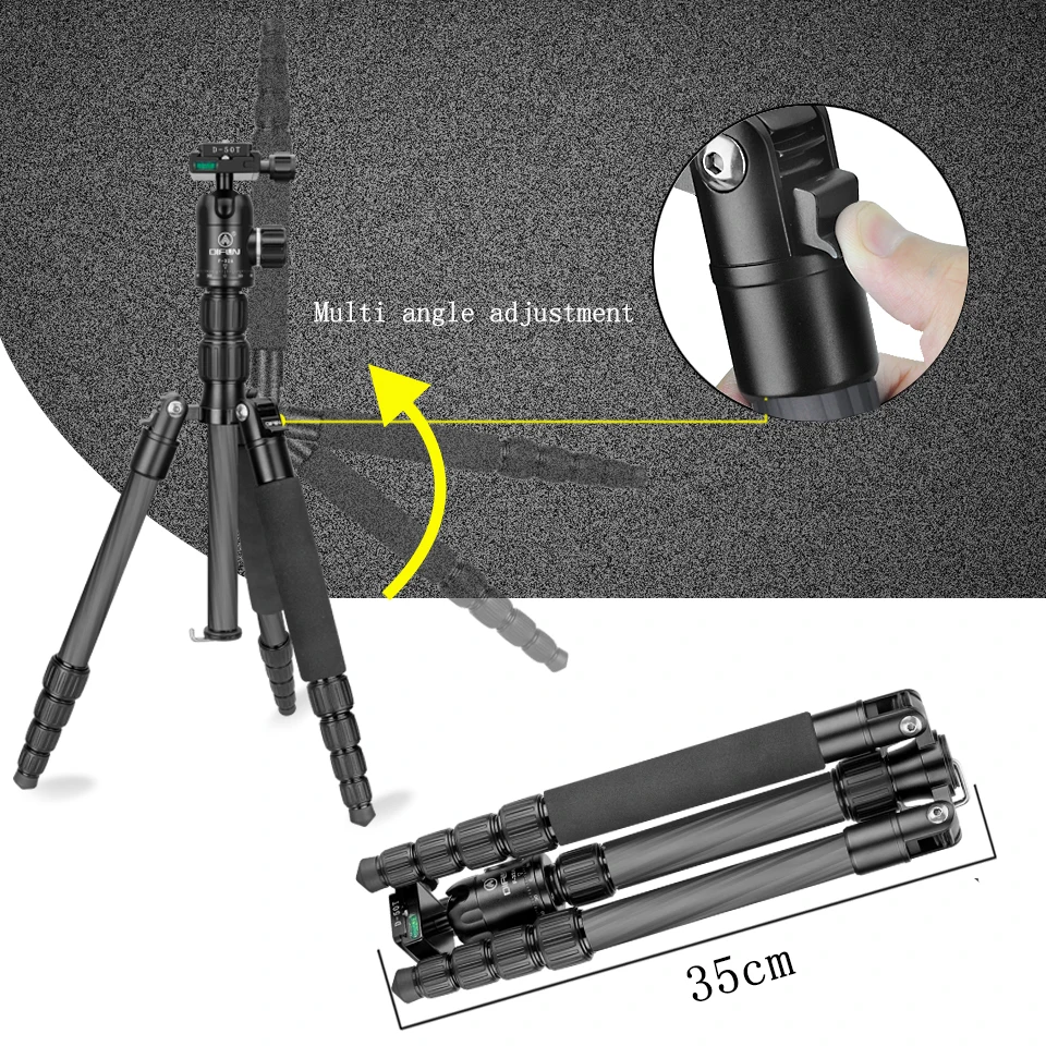 Введение: ★Центральная колонка инвертирована установки Центральная колонна инвертированная установка для осуществления самой низкой съёмки, макросъемки и специальной фотосъемки; ★Отсоединяемый монопод Он может быть превращен в монопод или трость самостоятельно, чтобы сделать вашу фотографию более разнообразной; ★Компактный и гибкий шланг 5 секций ноги могут регулировать высоту от 19,7 "(50 см) до 56,3" (143 см), с панорамной шаровой головкой, может быть перегнут на 180 градусов, складываемая длина всего 35 см, которая является супер портативной с сумкой для переноски штатива; ★Алюминиевая шаровая Головка для панорамной F-32A Литая шаровая Головка из алюминиевого сплава может поворачиваться на 360 градусов, помогая расширить диапазон активности камеры при панорамной съемке. (пузырьковый уровень помогает определить уровень и точный состав); ★Сильная стабильность 0,98 ''(25 мм) труба из алюминиевого сплава большого диаметра, грузоподъемность может достигать 17,6 фунтов (8 кг), обеспечивает безопасность и стабильность для вашей камеры. Технические характеристики: Материал: углеродное волокно Максимальная нагрузка: 8 кг Максимальная высота (угол наклона ноги 24 °) с удлиненной колонной: 1430 мм Количество секций ног: 5 Тип блокировки: фиксирующая ручка Центральная колонка: Да. Крепится к секции ног для преобразования в полноразмерный монопод. Полная головка штатива Тип: шаровая Головка F-32A Пузырьковым уровнем для спускового механизма: Да Пластина быстрого крепления (QR): D-50T Посылка включает в себя: 1 * GT-525C штатив-Трипод 1 * шаровая Головка F-32A 2 * ключ, дюймовый стандарт 3 * Нержавеющая сталь ноги шип 1 * сумка для переноски 1 * Инструкция 1 * сертификат