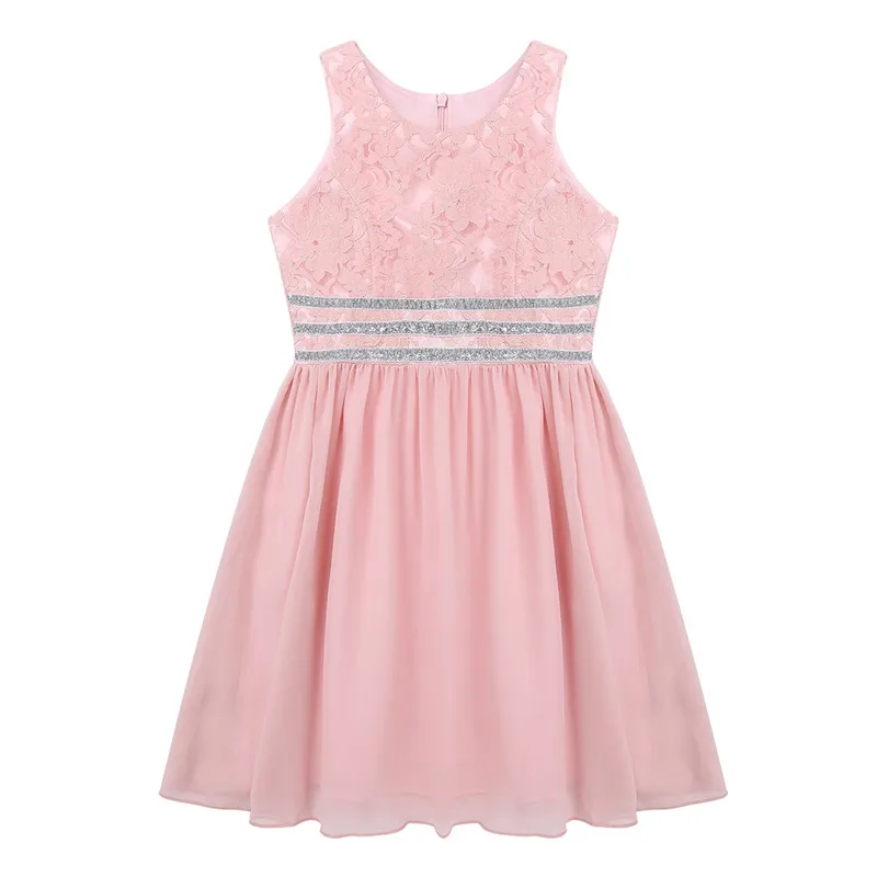 Без рукавов, круглый вырез, кружевной лиф с цветочной вышивкой, блестящий дизайн с высокой талией.