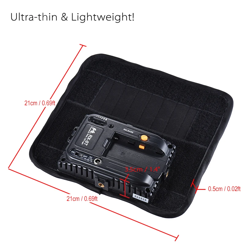 Falcon Eyes 18 W мини дневной свет 5600 K светодиодный освещение фотоизображений Водонепроницаемый светодиодный видео Лампа для фотосъемки на камеру Портативный Гибкий RX-8T Falcon Eyes 18 W мини дневной свет 5600 K светодиодный освещение фотоизображений Водонепроницаемый светодиодный видео Лампа для фотосъемки на камеру Портативный Гибкий RX-8T Светодиодный светильник FalconEyes RX-8T 18 Вт-это гибкая ткань, которая позволяет регулировать угол освещения, скручивая ткань. 5600 K дневной свет, CRI95, 0-100% Плавная Яркость, он предлагает естественный свет для профессиональной фотографии. Он может быть ручной, установлен на камеру/штатив. Это ручной светильник вес и легко носить с собой, который отлично подходит для использования в качестве отражателя без солнечного света или в качестве заполняющего света. С помощью дополнительного зажима, пользователь может установить рулонный светодиодный свет на осветительной подставке для использования в качестве светодиодный панели. Особенности: 1. 90 шт. высокого качества светодиодный свет, 5600 K близко к естественному свету, CRI95 восстанавливает истинный цвет изделия. 2. 18 Вт Выходная мощность, 0-100% бесступенчатая управляемая яркость. 3. Гибкая ткань для регулировки угла освещения. 4. С 1/4 "винтовым отверстием и холодным башмаком на нижней части, может быть ручной, установлен на камеру/штатив; 5. 2 способа подачи питания, Питание переменного тока или батарея F550. (Батарея в комплект не входит.) 6. Брызгозащищенный дизайн, может сопротивляться неожиданным брызгам воды. 7. Мини и легкий, портативный для переноски/хранения; Идеальный светодиодный мини-свет для профессиональной фотографии/видео/студии.