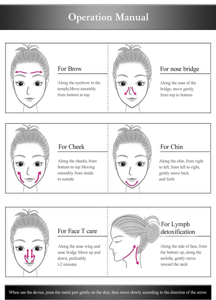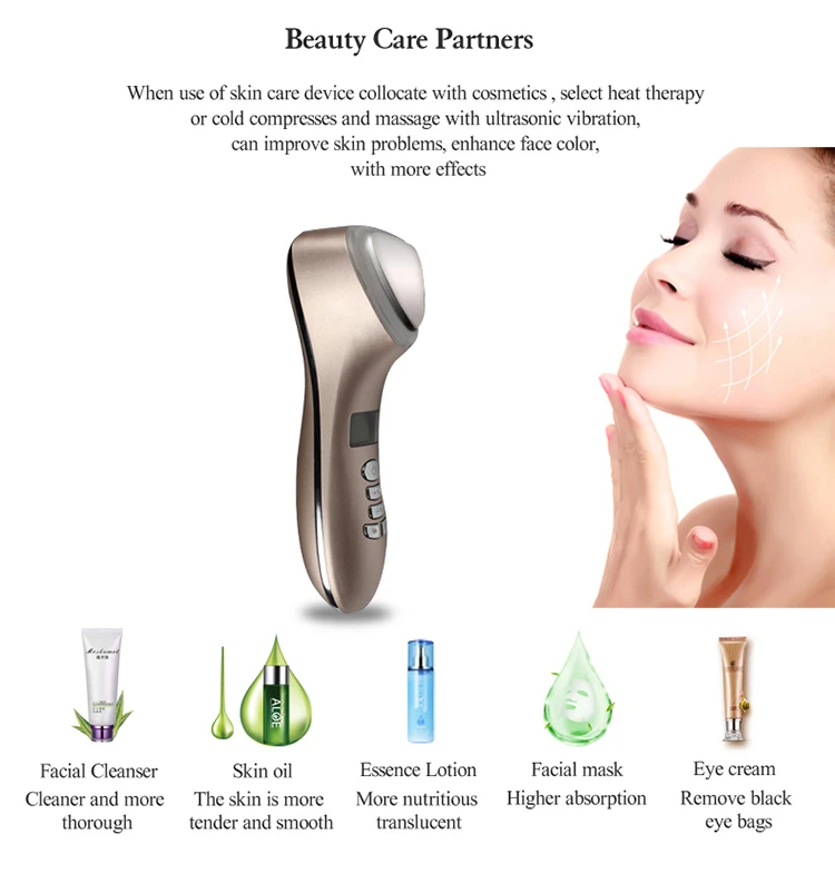 1. Омоложение кожи, уменьшение пор, подтяжка кожи, повышение упругости и блеска кожи. 2. Лимфодренаж, улучшает кровообращение, способствует детоксикации. 3. Помогает продуктам по уходу за кожей глубоко впрыснуть в кожу, избежать питания высвобождения. Держите увлажняющий крем. 4. Удаление морщин, против отечности. 5. Подтяжка лица, отбеливание, удаление черных кругов. 6. Стимулирует кровообращение, лимфодренаж, Детокс. В комплект входит: 1x ультразвуковой массажер для лица Горячий Холодный Молоток 1x адаптер питания 1x руководство по эксплуатации на английском языке