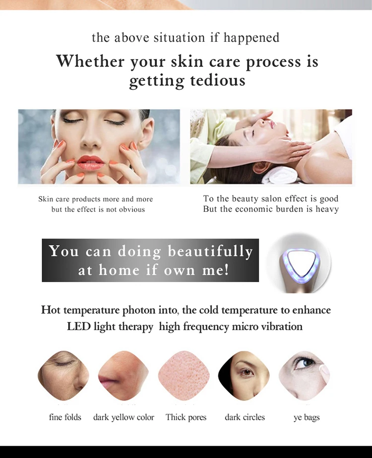 Спецификация: 1. Название продукта: 7 LED Свет ультразвуковой горячий холодный массажер для лица 2. Мощность: 1 Вт 3. Номинальное напряжение: 5 в пост. Тока 4. Напряжение: 3,7 в 5. Батарея: литиевая батарея 1000 мАч 6. Материал: АБС-пластик 7. Время зарядки: 2 ч 8. Размеры: 50x50x150mm Обработка кода (5-10 °C ): 1. Сужает поры кровеносных сосудов, улучшает сужение пор; 2. Укрепляет коллагеновые волокна, делает вашу кожу упругой, выцветает морщины И гусиные лапки; 3. Эффективно сокращает варикозное расширение вен, опасные отходы, с большей долей шансов, будут очищены, могут помочь выцветать и устранить темные пятна; 4. Для снижения чувствительности нерва, уменьшения покраснения и отечности кожи, особенно для чувствительной кожи. Горячая обработка (40-45 °C ): 1. Согревает, делает человека чувствовать себя теплым и комфортным, расслабляет мышцы, снимает боль и боль; 2. Способствует циркуляции крови и помогает лучше поглощать продукты по уходу за кожей; 3. Улучшает метаболизм кожи, выделяет отходы токсинов, помогает выцветать глаза мешок и темный круг. Светодиодные фонари: 1. Красный свет: отбеливание и увлажнение кожи 2. Синий свет: удаление морщин