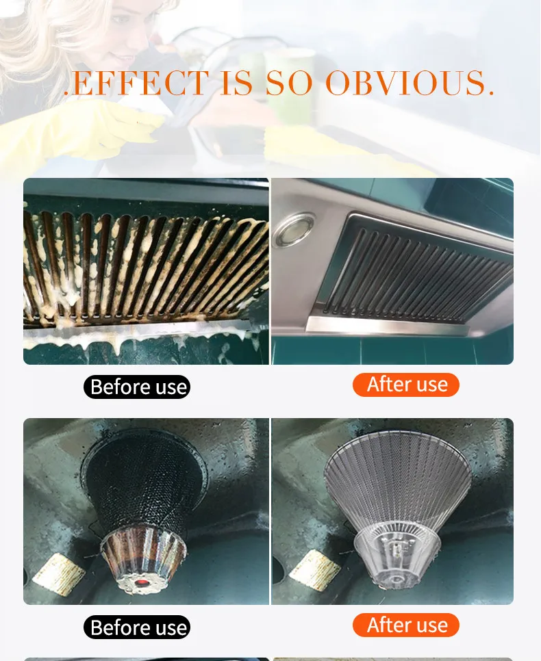 Подходит для: машины Lampblack, вытяжного вентилятора, плиты, кухонной раковины и других зон загрязнения тяжелым маслом Использование: распылите моющее средство непосредственно на жирную грязь, подождите 1-2 минуты, затем очистите и повторно Используйте чистой водой.