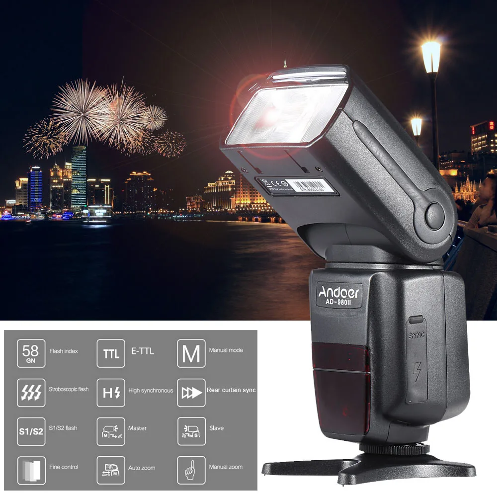 С большим количеством направляющих GN58, Andoer AD-980II действительно хорошо работает. Ведущая высокоскоростная вспышка sync составляет до 1/8000s, достаточно, чтобы захватить удивительный момент. Предназначен для цифровых зеркальных камер Canon, также может использоваться в качестве главного или подчиненного устройства.
