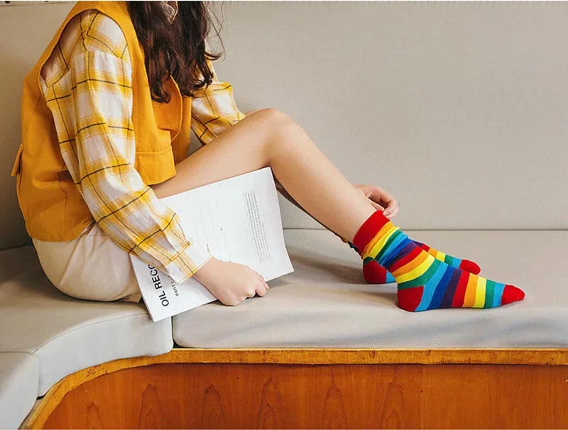 Японские модные креативные носки в стиле Харадзюку; Забавные Женские носочки в полоску с радугой в стиле колледжа; Оригинальные хлопковые носки без пятки