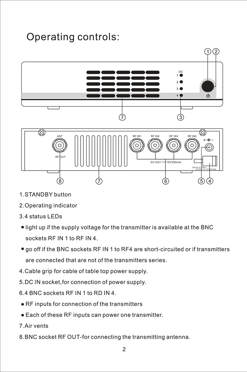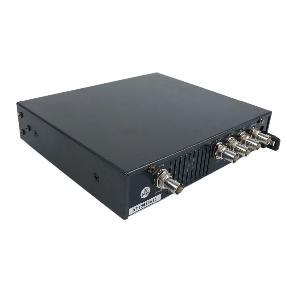 Важные инструкции по безопасностиПожалуйста, внимательно прочитайте инструкцию.Я принимаю во внимание все предупреждения и следую всем инструкциям в этом руководстве по эксплуатации.Очистите только мягкой тканью.L обслуживание требуется, если устройство было повреждено каким-либо образом,Жидкость пролилась, предметы упали внутрь, устройство подверглось воздействию дождя или влаги, не работает должным образом или было сброшено.Предупреждение: чтобы уменьшить риск пожара или электрического удара, не используйте устройствоL рядом с водой и не подвергайте ее воздействию дождя или влаги. Не размещайте предметыL заполнен жидкостями на устройстве.L не блокирует вентиляционные отверстия.L не устанавливайте устройство рядом с любыми источниками сердечных сокращенийХарактеристики ПродукцииАктивный комбинированный передатчик-это многоканальное оборудование, которое используетОбычная антенна.С активным передатчиком, сигналы до четырех типов передатчиковБеспроводного монитора в ушах можно комбинировать на одну антенну. Также можноОбразуют антенные массивы с соединением четырех антенн для обеспеченияПолностью точное покрытие антенны.Четыре высокочастотные антенны входного сигнала обеспечивают подключение входного сигналаОбщий выход и не может быть удален.Активный передатчик также может быть источником питания для четырех передатчиковИли антенна между тем входным гнездом BNC.Активный комбинированный передатчик Подходит для следующих областей применения:Многоканальные системы мониторинга для сценического использования.L Многоканальная Беспроводная микрофонная антенна для сценического использованияТехнологический индекс:Частотный диапазон 500-950 МГцАмортизация распределения 0 дБ (± 1 дБ)RF Входная мощность Макс. 30 мВт на входеСопротивление 50ΩНапряжение питания, работающего на постоянном токе 12 В в 3AДиапазон рабочих температур от-10 °C до + 55 °CРазмеры корпуса 212*168*43 ммВес 1470 г