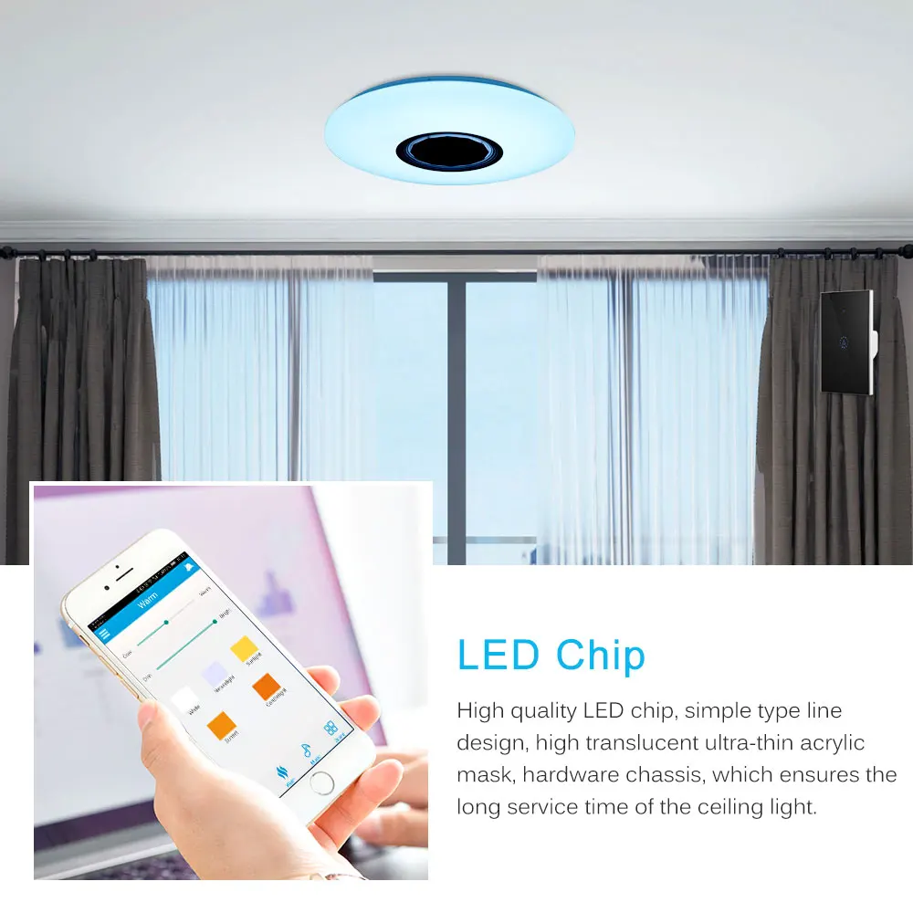 Особенности: Светодиодный чип Высококачественная светодиодная микросхема, простой дизайн линий, высокая полупрозрачная ультратонкая Акриловая Маска, аппаратная конструкция, что обеспечивает долгий срок службы потолочный светильник. Высокая яркость Светодиодный чип с высоким люменом, сверхтонкий, с высокой проницаемостью, светильник, маска, достаточно, чтобы светильник был ярким. Безопасность освещение Нет вспышек, нет бликов и излучения, более здоровый для ваших глаз. Энергосберегающий Светодиодный светильник высокой мощности, с высокоэффективным источником питания, более 80% традиционных ламп накаливания, такая же мощность в 10 раз ярче, как и лампа накаливания, а также экономит расходы на замену. Универсальный Потолочный светильник, не мерцающий и устойчивый, отлично подходит для вашей гостиной, кухни, спальни, офиса, учебы и т. Д., создает современный и теплый свет. Параметры: Тип: СВЕТОДИОДНЫЙ полноцветный потолочный светильник для спальни Материал: АБС-пластик Количество: 1 шт. Цвет: белый Мощность: 36 Вт/60 Вт Напряжение: 220 В Светильник источник света: светодиодный Светильник Цвет: разноцветный "Красный-зелёный-желтый Приложение: ilink Аккумулятор: 2 батарейки AAA (не входят в комплект) Диаметр: 36 см/14,15 дюйма Вес нетто: 1450 г/3,19 фунтов