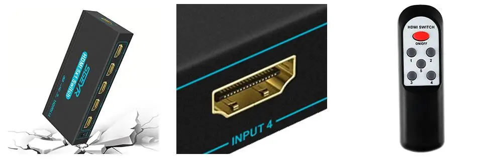 HDMI 1.4 (HDCP 1.4)Switch allow you to switch between Five HDMI sources to One HDMI display (5-in, 1-out) Plug-N-play, manually press the button or IR wireless control this 5x1 hdmi selector switcher easily.Supports Full HD, 3D,signals up to 4K 30Hz and below