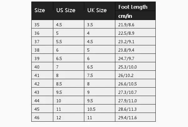 | Size::35 | US Size::4.5 | UK Size::3.5 | Foot Length (cm/in)::21.9/8.6 |