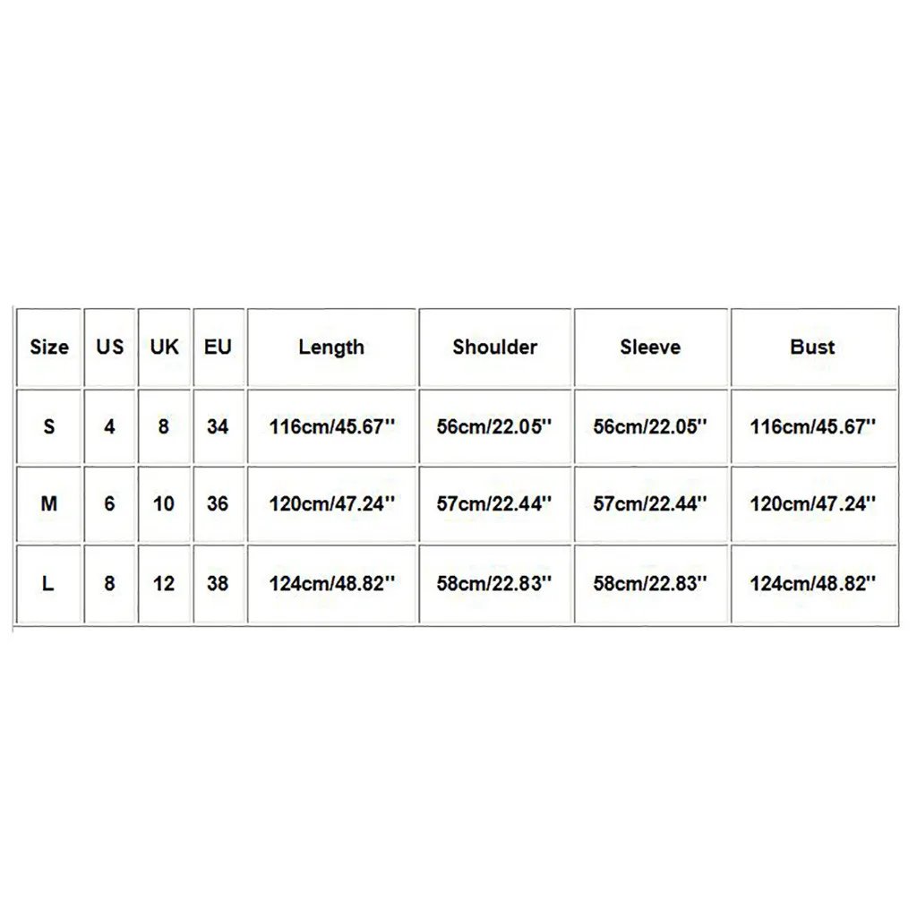 | Размер: M | США: 6 | Великобритания: 10 | ЕС: 36 | Длина: 120 см/47,24'' | Ширина плеч: 57 см/22,44 дюйма | Рукав: 57 см/22,44 дюйма | Обхват груди: 120 см/47,24 дюйма |