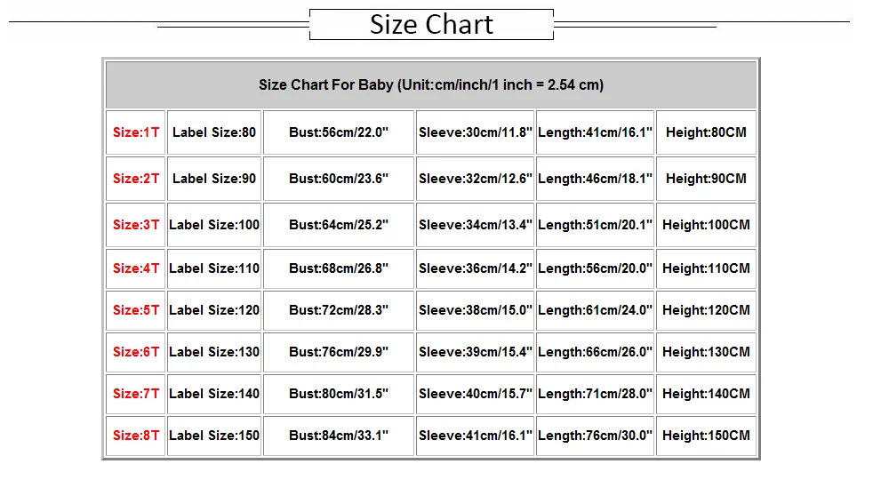 | Размеры:Размеры для возраста от 1 | Этикетка Размеры:80 | Бюст: 56 см/22,0" | Рукав: 30 см/11,8" | Длина: 41 см/16,1 дюйма | Рост: 80См |