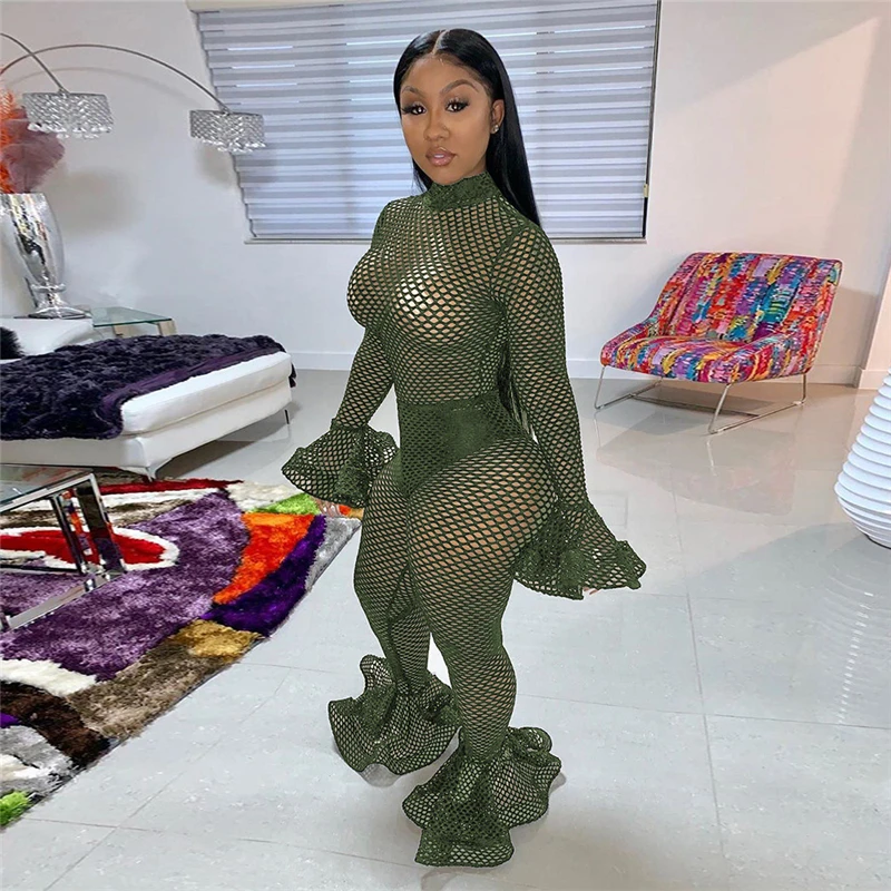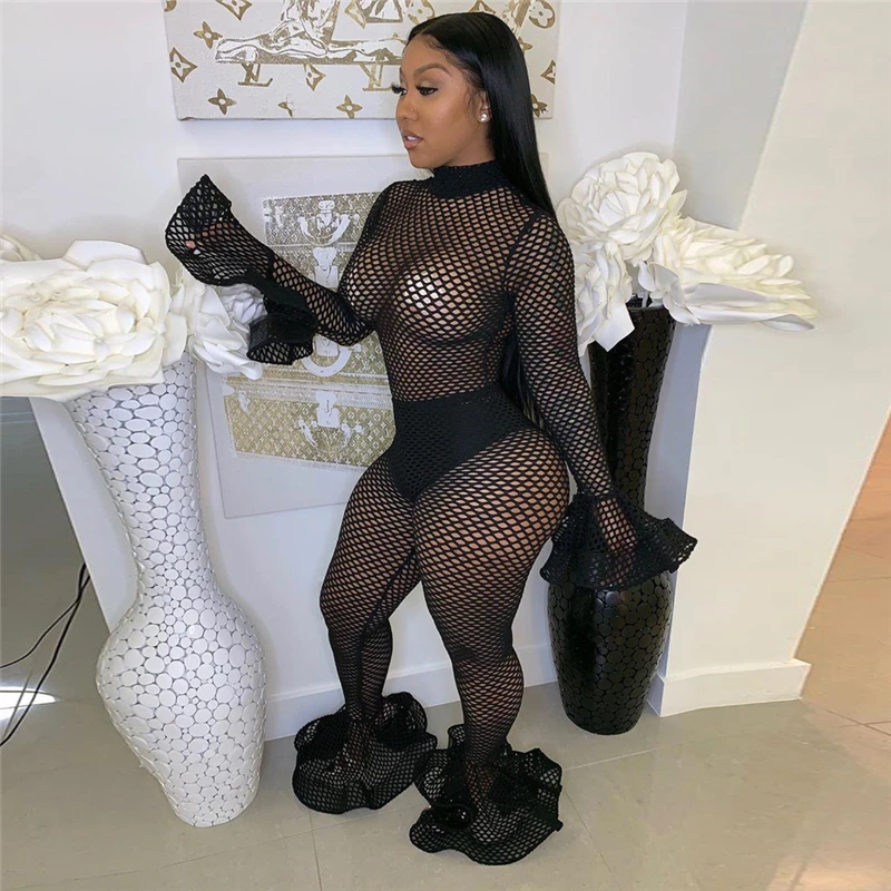 OLOEY женский сексуальный полый сетчатый комбинезон водолазка с длинными расклешенными рукавами брюки для ночных клубов комбинезон женский Ажурный комбинезон
