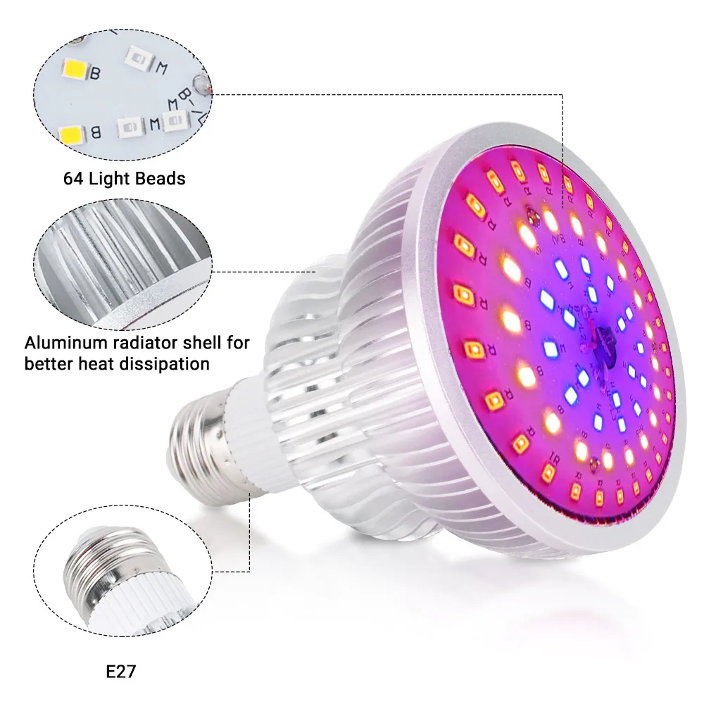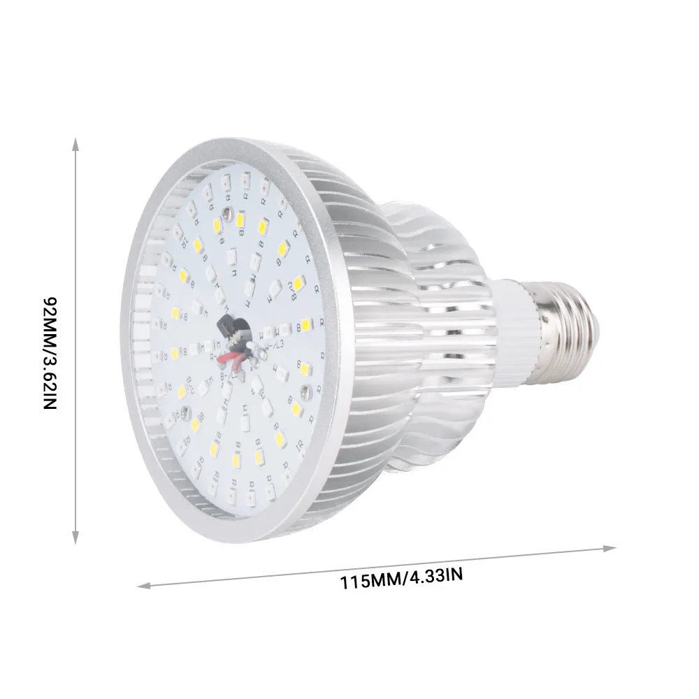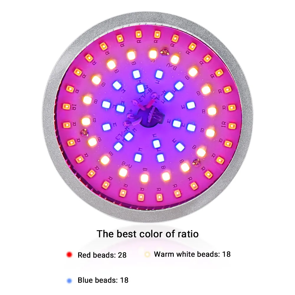 Материал: алюминий + ПК Модель лампы: 2835 чипов (всего 64 светодиодный, красный 28 + синий 18 + желтый 18) Мощность: 50 Вт Входное напряжение: 85-265 В переменного тока Тип гнезда: E27 Вес: 250 г Размер: 115*92 мм