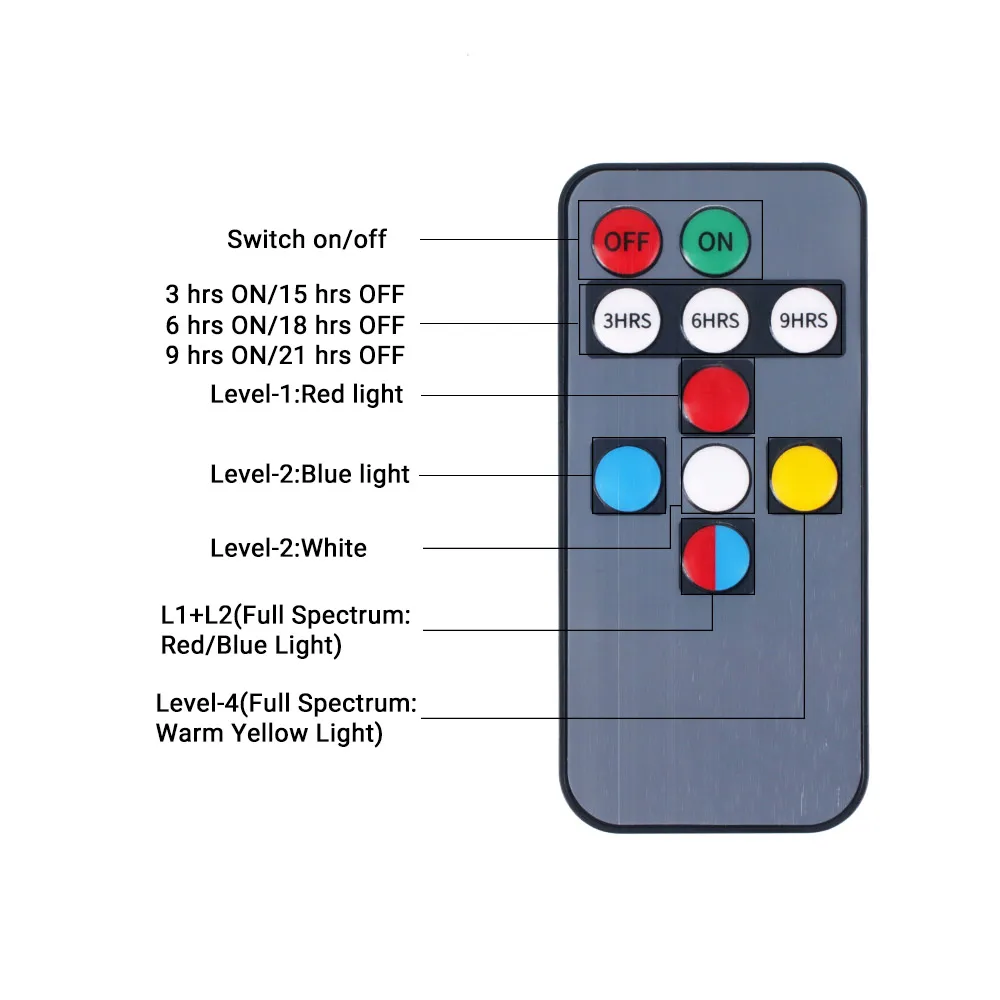 1. Дистанционное управление, выключено и включено, выключено, включено, 2. Функция синхронизации, нажмите кнопку синхронизации, мигающий светильник, вы можете установить 3 часа, 6 часов, 9 часов. 3. Светильник режимов работы: нажатие кнопки, красная кнопка-красный светильник, Синяя кнопка-синий светильник, желтая кнопка-солнечный светильник, красная и синяя кнопка-красный и синий светильник, белая кнопка-это полный светильник (красный/синий/желтый)