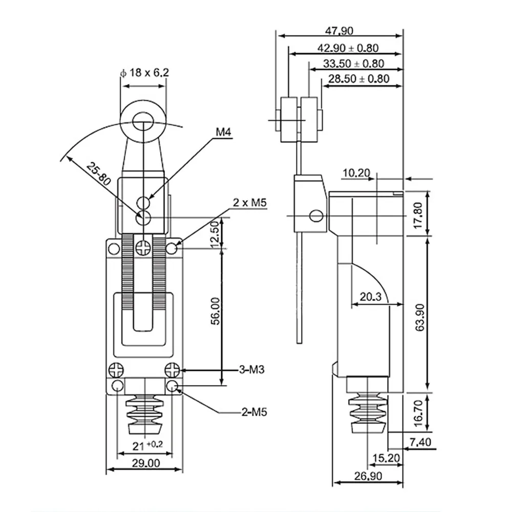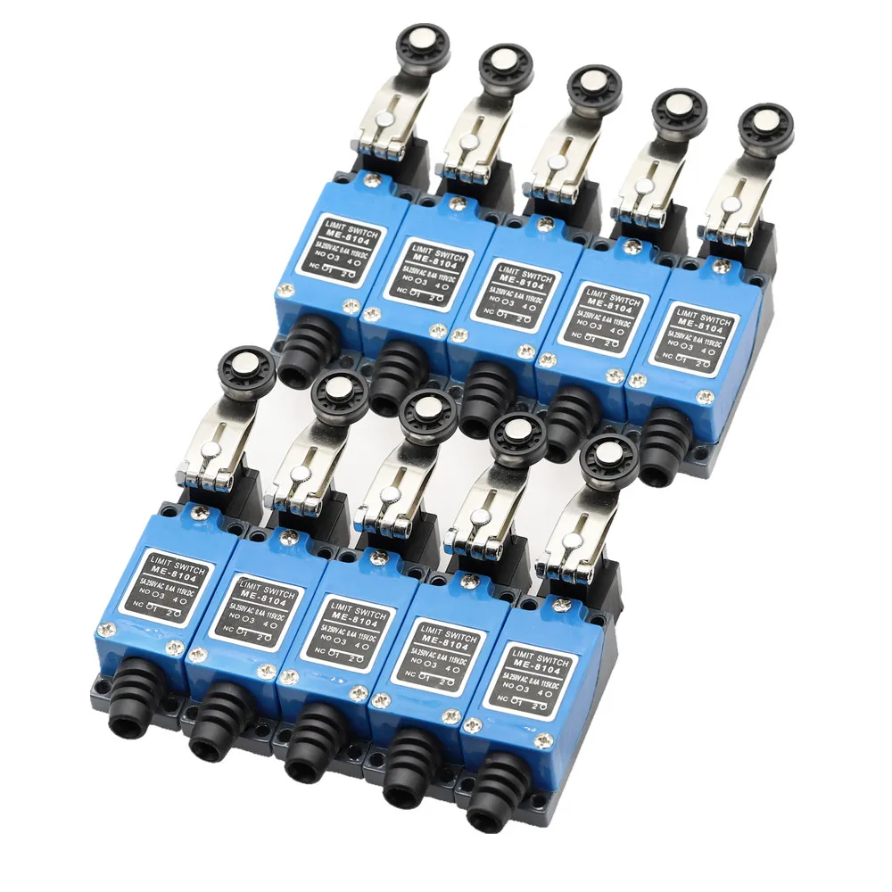 Название продукта: концевой выключатель Модель: ME-8104 Тип: поворотный рычаг с роликом Питание: AC 250V, 5A DC 115V, 0.4A Диаметр фиксирующей резьбы: 4 мм/0,15" Размеры ролика: ~ 1,8x0,7 см/0,7x0,3 дюйма (Д * В) Длина рычага: 4,6 см/1,8" Габаритный размер: 12,3x2,8x3,9 см/4,8 "x 1,1" x 1,5 "(Д * Ш * В) Цвет: черный и синий Материал: пластик, металл и Резина
