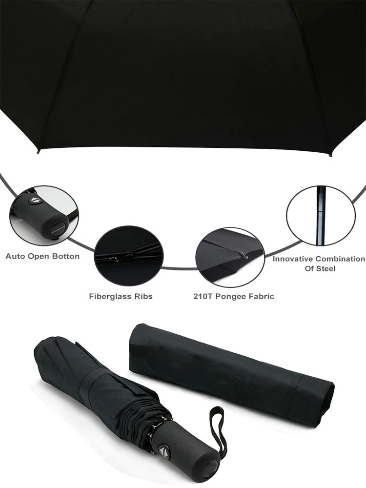 Характеристики: Тип: полностью автоматический зонт Цвет: черный Функция: три-складной SPF:UPF 30 +,TUVA) и <5% Защита от дождя: высокая Ветрозащитный: высокий Открытие: автоматическое открытие и автоматическое закрытие Посылка включает в себя: 1 * зонтик с логотипом quattro