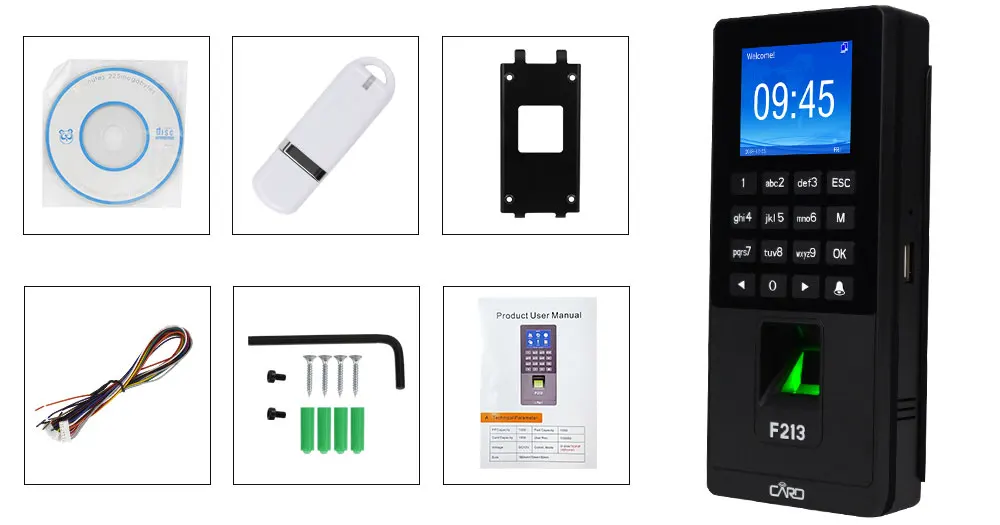 1 машина контроля доступа по отпечаткам пальцевCD-диск с программным обеспечением (опционально)-1 шт.1 xU-диск1 х настенный кронштейн3 x Кабель1 х пакет винтов1 x Руководство пользователя10 брелков RFIDХарактеристики продуктаДисплей экран 2,4 дюймов TFT Цвет экранВысокоточный оптический коллектор с защитой от сухого и влажного отпечатков пальцевЕмкость отпечатка пальца 1000 штукЕмкость пароля 1000 штукЕмкость карты 1000 штукЕмкость записи 100000 изделийСпособ связи u-диск, TCP/IPМетод проверки отпечатков пальцев, пароль, rfid картаU диск загрузки/загрузки данных Стенд поЗапись функции запроса естьИнтеллектуальное обучение по отпечаткам пальцевОпределение угла полного распознавания углаЭффективная площадь сбора 16*16 ммОпределите скорость ≤ 1 секундыКоэффициент отклонения (FRR) ≤ 0.1%Коэффициент распознавания (Дальний) ≤ 0.0001%Способ работы в автономном режиме/онлайнЯзык дисплея китайский/английскийГолосовые подсказки высокого разрешения человеческого голосаТемпература рабочей среды: от 0 °C до + 45 °CВыход и вход сигнала Wiegand 26/34Интерфейс контроля доступа для: 3-го вечерние блокировки, датчик двери, кнопка выхода, сигнализация, дверной звонокРазмер машины 165 (Д) × 75 (Ш) × 30 (В) ммСхема проводки1. Если вы хотите использовать его в качестве отпечатка пальца посещаемости времени, просто подключите его к вилке питания DC12V, а затем ОК :)2. Если вы хотите использовать его в качестве клавиатуры контроля доступа по отпечаткам пальцев, то необходимо работать с источником питания DC12V,Электрический замок, кнопка выхода.(Примечание: Оба источника питания, замок, кнопка выхода, дверной звонок и т. д. не включены в посылка, нужно купить дополнительно)
