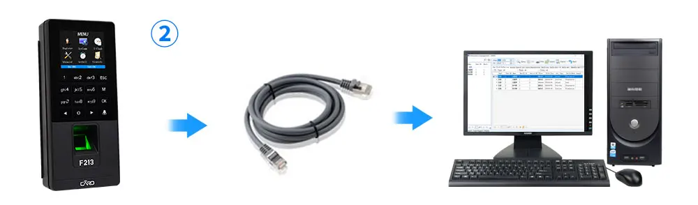 2, это устройство поддерживает подключение к любому компьютеру через TCP/IP сеть связи,Загрузите данные отчета о посещаемости в один клик на компьютере.