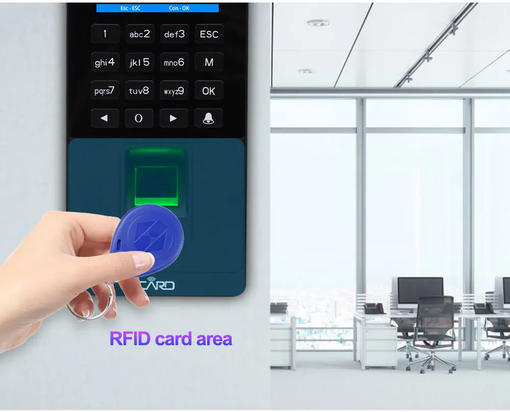 С этим рекордером времени отпечатков пальцев, вы можете иметь ваш персонал проверить с помощью отпечатков пальцев, RFID карты и пароль.