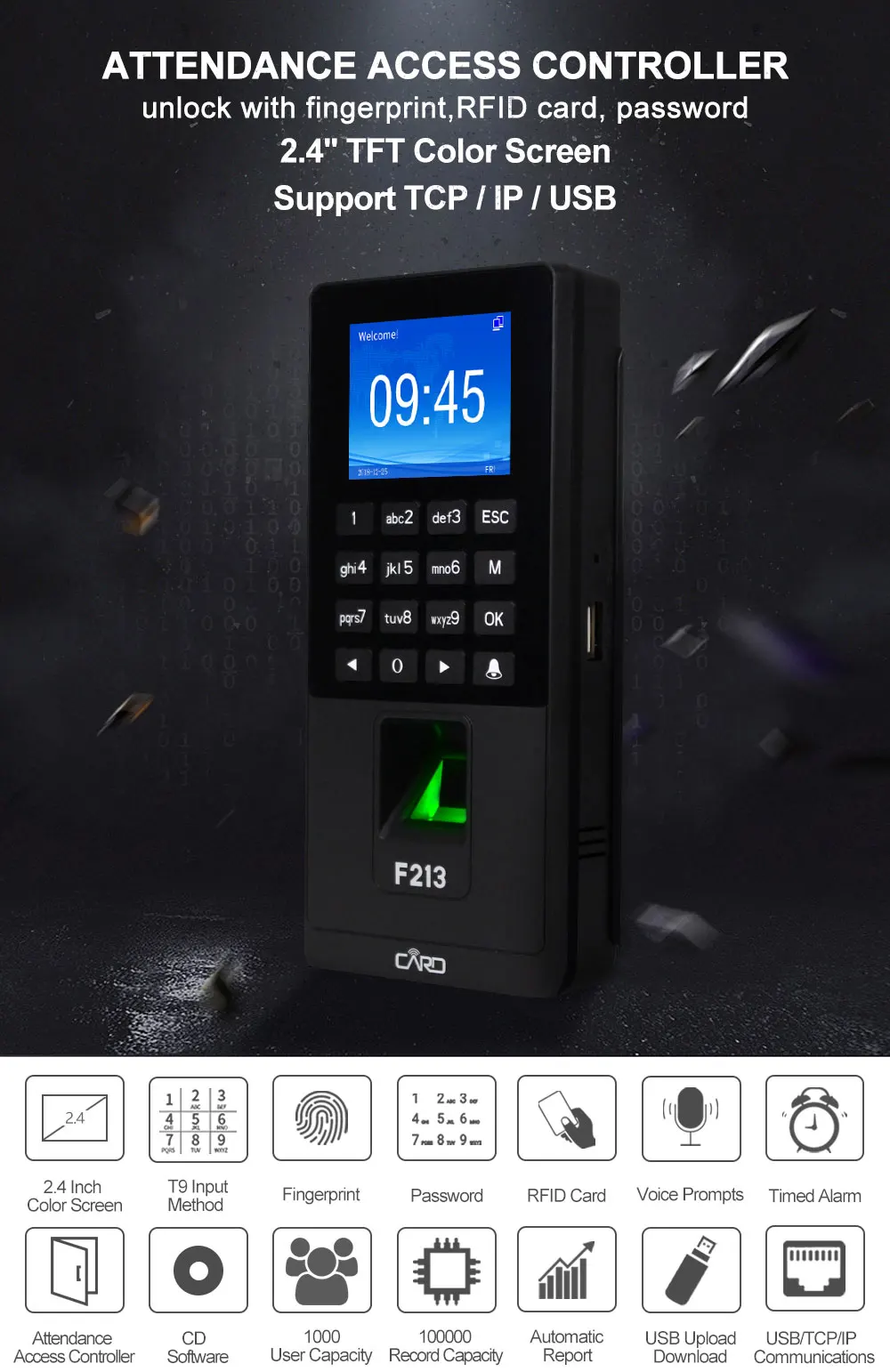 Особенности продукта1) 2,4 дюймов TFT экран.2) строго следуйте стандарту продукта национальной безопасности.3) Использование энергосберегающего датчика отпечатков пальцев и функции управления питанием делает продукт идеальным.4) 3 способа идентификации посещаемости: отпечаток пальца, пароль, rfid-карта.5) Поддержка TCP/ IP метода связи. Поддержка загрузки флеш-накопителя USB. (опционально)6) Гуманное напоминание о языке.7) подходит для входов и выходов из офиса, фабрики, отеля, школы и т. д.8) T9 входной метод редактора, на имя машины, отдел, частоту и другую информацию, может быть непосредственно выводит отчеты о посещаемости, пользовательская операция проста.9) поддерживает английский, SPanish, китайский язык.10) имеет Wiegand26/34 вход/выход, релейный выход, дверной звонок.Может использоваться как автономная машина для распознавания отпечатков пальцев и автономная клавиатура контроля доступа.Информация о продукте2,4 дюймов Цвет на тонкопленочных транзисторах на тонкоплёночных транзисторах Экран1. Материал: АБС/ПВХ