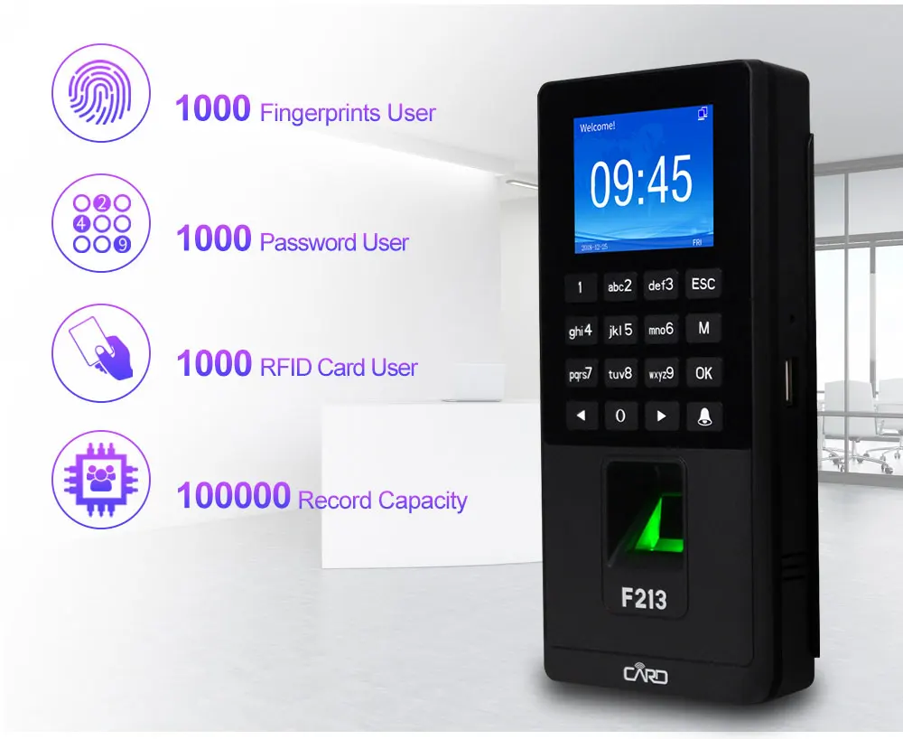 Поддержка 5000 пользователей, 1000 отпечатков пальцев, 1000 паролей, 1000 RFID карт, 100000 емкость записи.