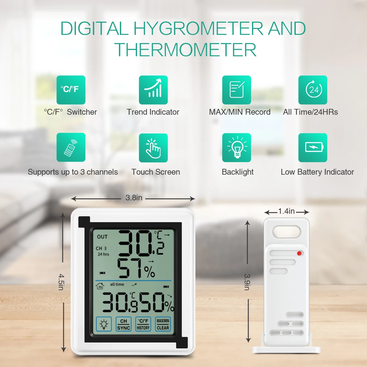 [Большой экран & высокие/низкие записи] термометр предлагает гораздо более четкий экран. Возможность отображения показаний от 3 наружных дистанционных датчиков для отслеживания нескольких мест. Обеспечивает точные показания влажности и температуры как внутри, так и снаружи одновременно.