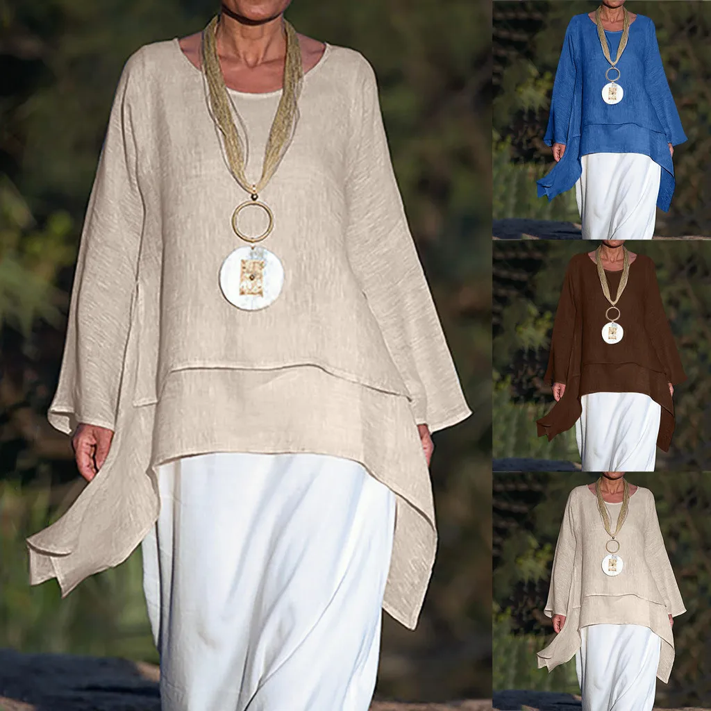 Женские повседневные асимметричные блузки размера плюс с длинным рукавом с круглым вырезом рубашка-Туника Топы