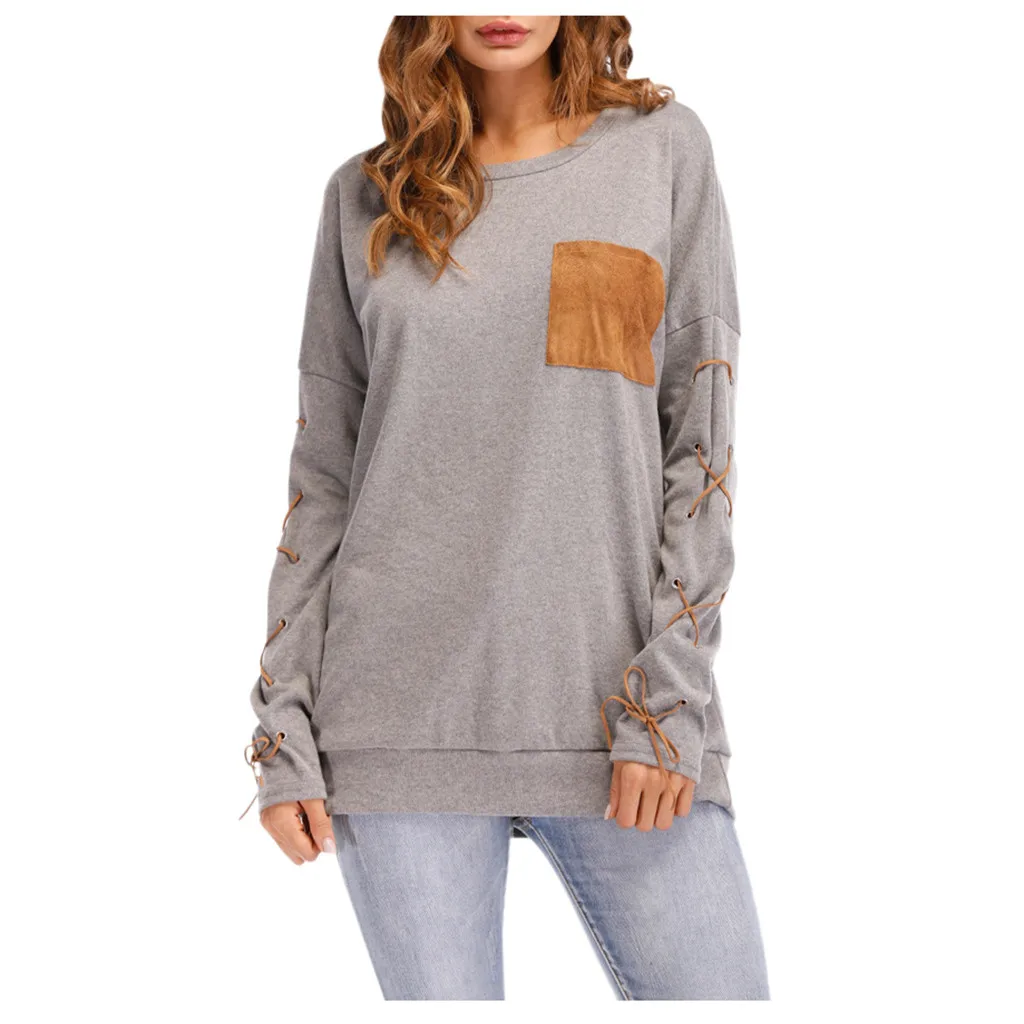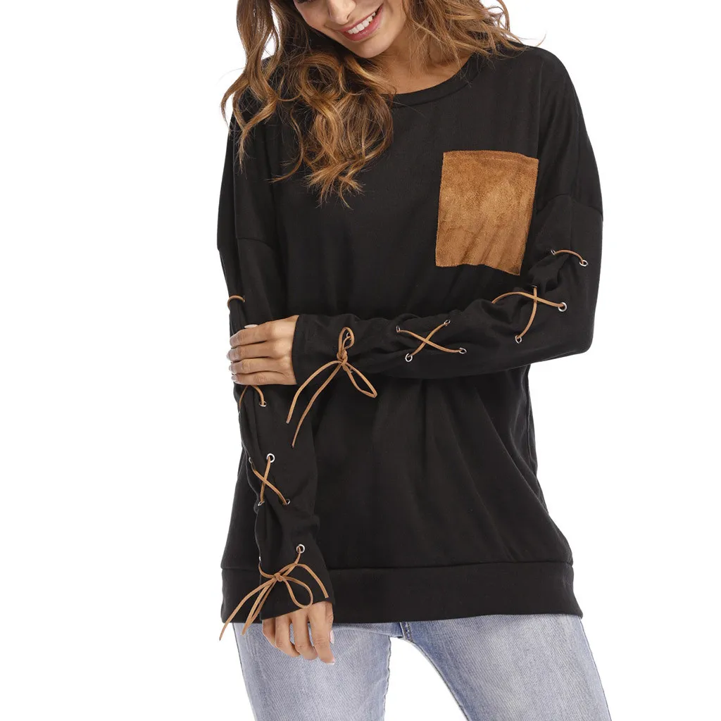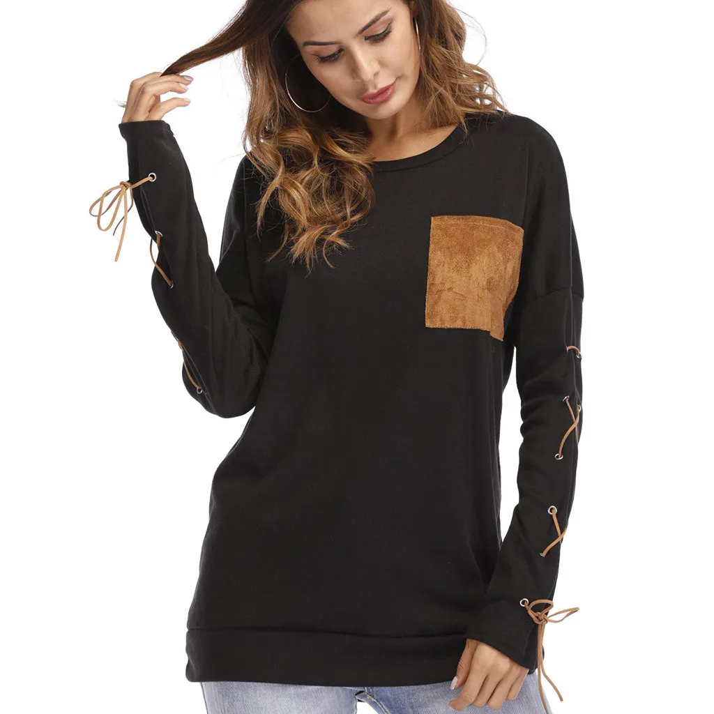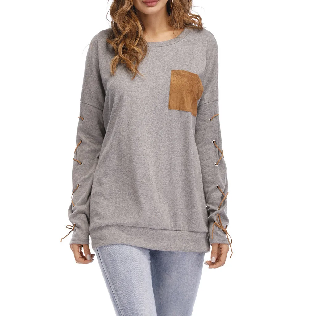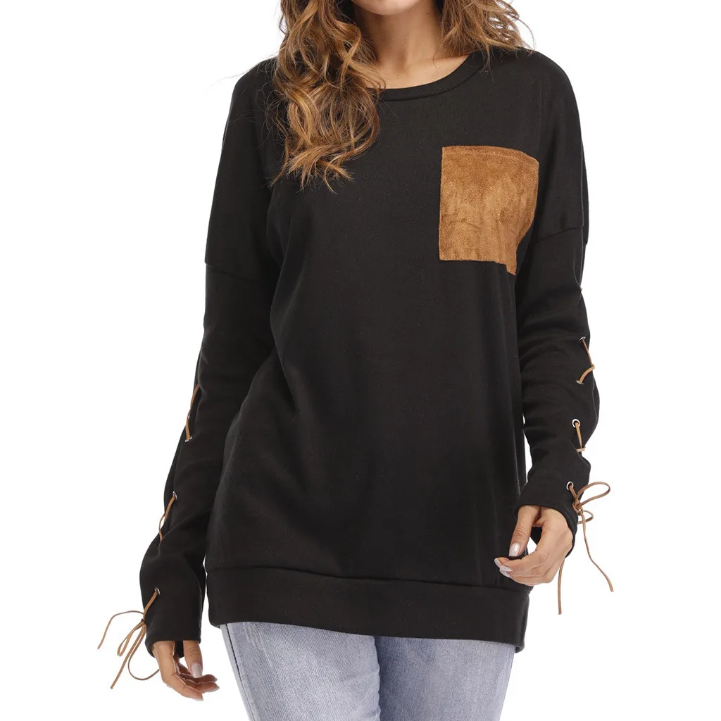Женская толстовка с круглым вырезом и длинными рукавами с ремешком на манжете и карманом