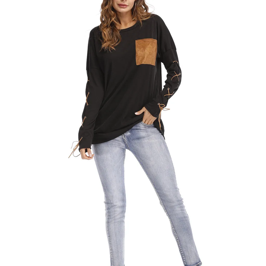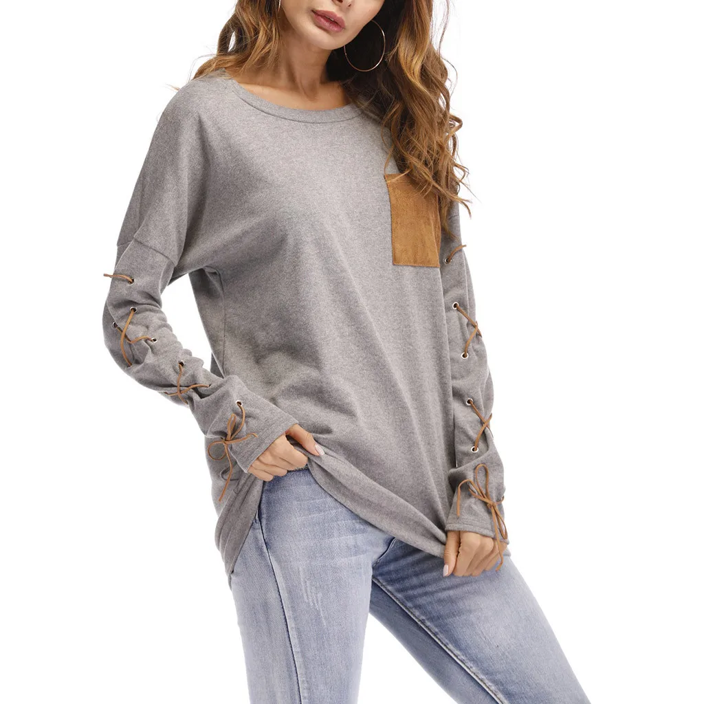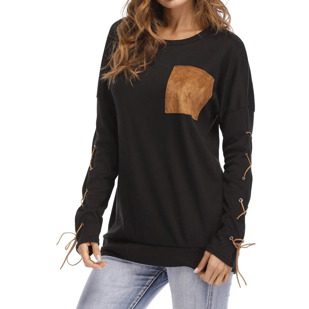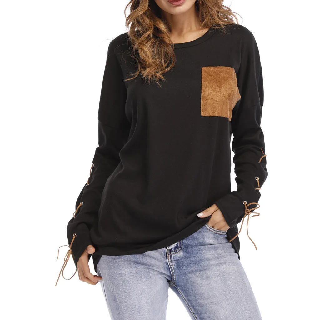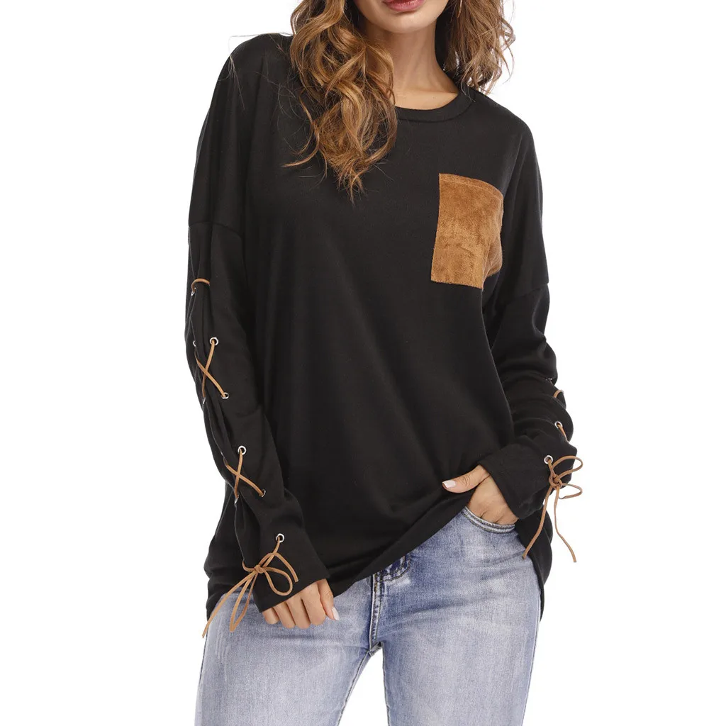 Женская толстовка с круглым вырезом и длинными рукавами с ремешком на манжете и карманом