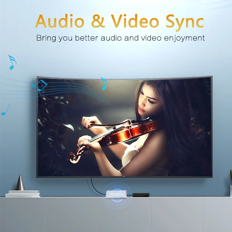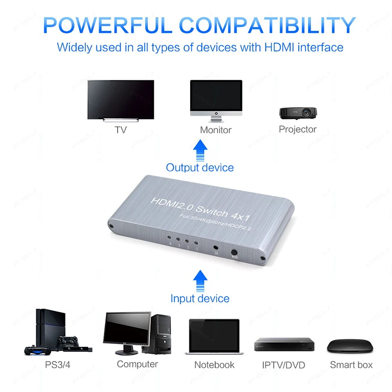 This HDMI Switcher 4x1 supports to connect four HDMI devices to one TV or Monitor which have HDMI interface. Four pictures can be switched via the switch button or the remote control which can makes the switch among the 4 input HDMI simple and intuitive. What is most of it, the max bandwidth of 18Gpbs and max resolution of 4K 60Hz thanks for the HDMI 2.0 V which can makes the user gets live pictures of each connected device.