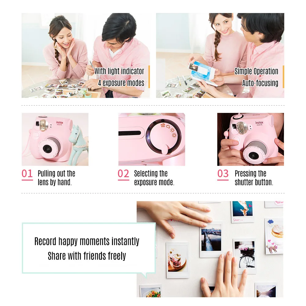 Мгновенная Камера Fujifilm Instax Mini7c с милым и милым дизайном outlook-идеальный фестиваль или подарок на день рождения для друзей и семьи. Супер простая операция, просто нажмите кнопку и подождите несколько минут, тогда вы получите красивые фотографии. Благодаря этому вы можете свободно записывать счастливые моменты и мгновенно делиться ими со своими друзьями и семьями.