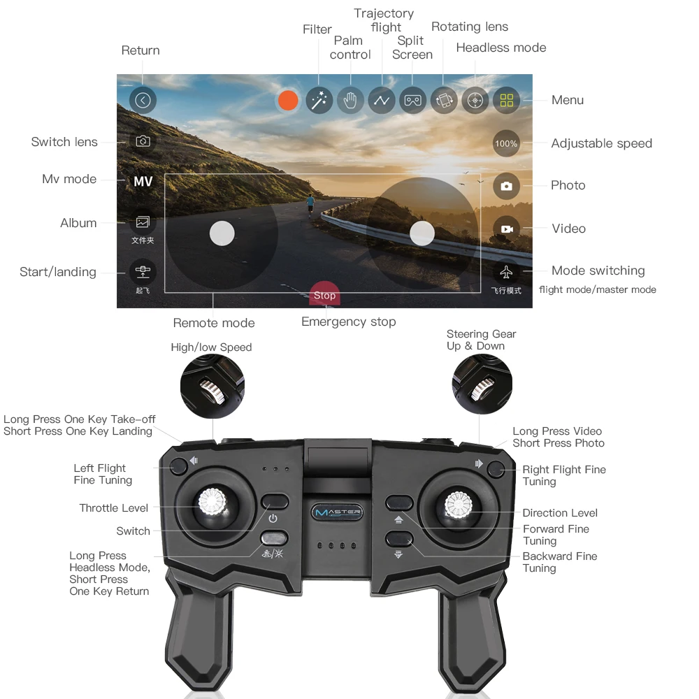 Функция: вверх/вниз, поворот влево/вправо, вперед/назад, боковой полет, камера 1080P, оптическое позиционирование потока, Wi-Fi соединение 2,4G, передача в реальном времени, управление ладонями, MV edition, фото/видео жестов, один ключ для возврата, один ключ для взлета/посадки, режим траектории полета, переключение скорости, Безголовый режим, режим V/R, Переключение режима работы.