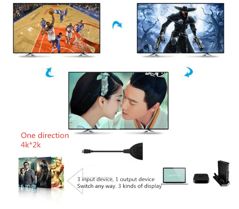 HDMI Switch 3 в 1 out-это небольшой высокопроизводительный HDMI-коммутатор. Уникальный дизайн и утонченный внешний вид. Несколько входов подключаются к множеству HD видео источников, таких как PS3 и HD приставки. Выход отправляет HD аудио/видео сигналы на HDTV. Он имеет хорошую совместимость, совместим с Blu-Ray DVD, спутниковым ТВ, PS3, Blu-Ray плеером, Xbox360. .. Разрешение до 380*2160P 4k * 2K