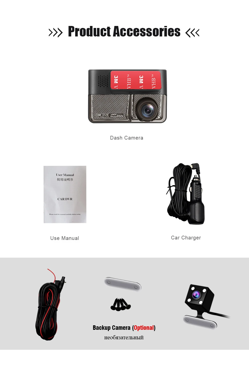 • 1 автомобильная камера • 1 крепление для камеры • 1 автомобильное зарядное устройство • 1 руководство пользователя на английском языке • 1 х задняя камера с кабелем (опционально)
