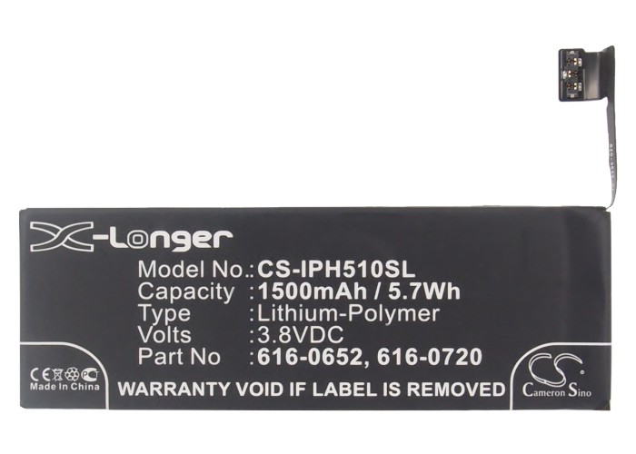 Cameron sino Модель: CS-IPH510SL номер детали: Apple 616-0652 616-0720 616-0728 Совместимость для: apple A1234 A1457 A1516 A1518 A1528 A1529 A1530 A1533 iPhone 5S ME341LL/A ME342LL/A ME344LL/A me/ A ME347LL/A ME348LL/A ME349LL/A Вольт: 3,8 V Тип: литий-полимерный Цвет: черный Емкость: 1500 mAh/5,70 WH Размер: 91,00x32,90x3,90 мм Гарантия: 12 месяцев