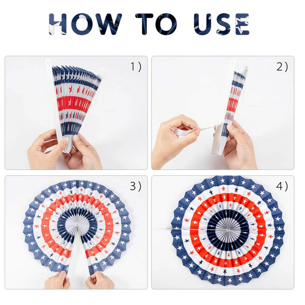 - 6 Pcs red, white and blue fans in six different stars-and-stripes designs for use as hanging decorations.