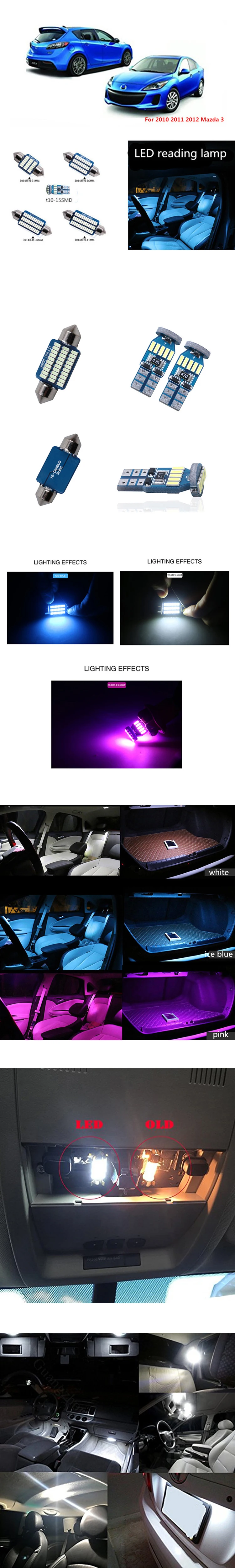 Product Description: This listing features an Brand New, super bright Xenon White LED Light Interior Package Kit For 2010-2012 Mazda 3 These lights are high quality LED Bulbs that will replace your factory dull and high consumption filament bulb. This package contains 9 pieces LED lights,includes: Map light (2 pieces) Dome light (2 pieces) Trunk / Cargo (1 piece) License plate light (2 pieces) Spare light (2 pieces) Description: All LED bulbs are 100% plug and play, with no modification needed. Long life-typically lasting 50,000 hours Will never flicker or fade after extended use Easy to install. Plug & play. Canbus,error free. If the LED light does not work, please flip it 180 degrees.