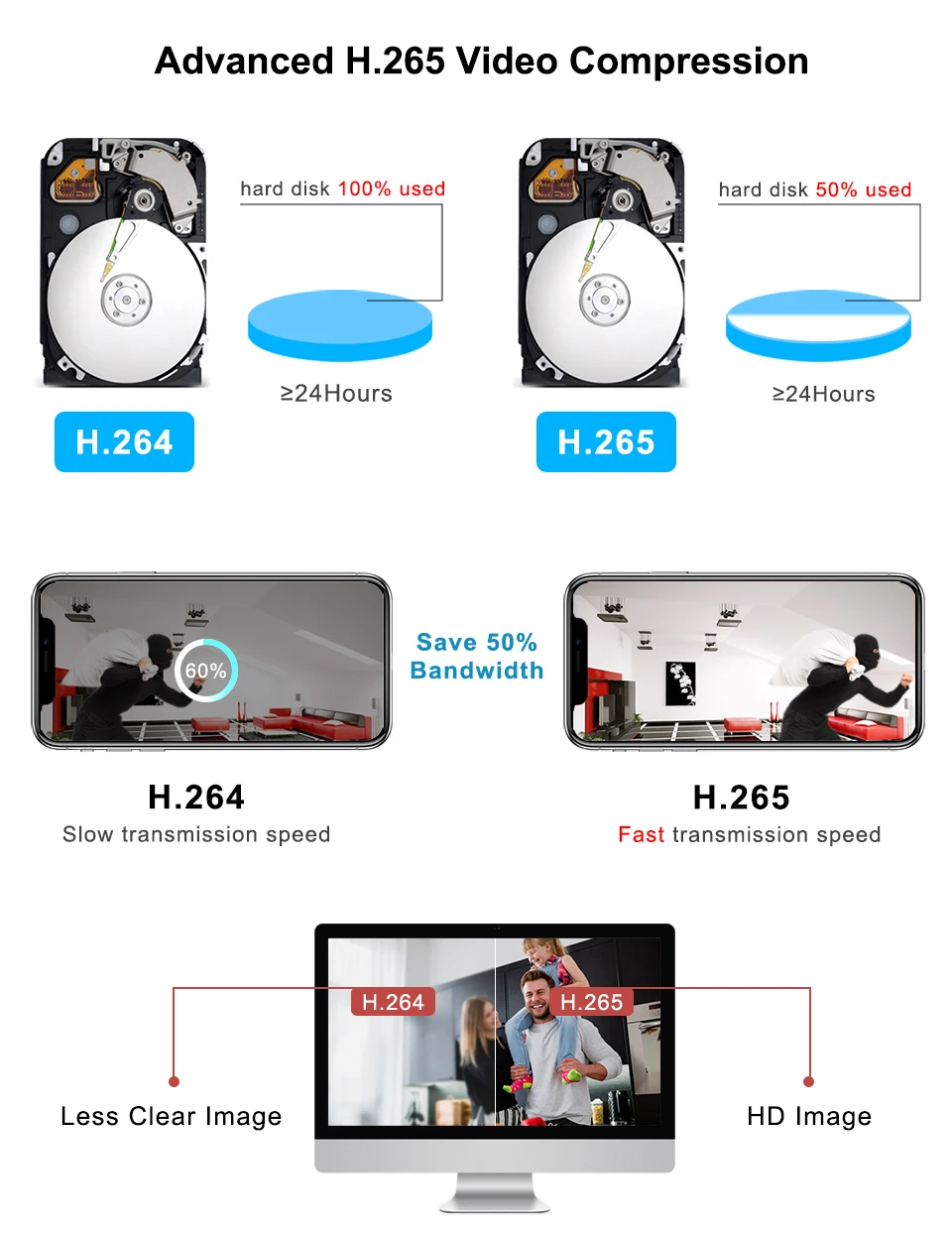 Ваша камера безопасности и NVR оснащены высокоэффективным кодированием видео H.265. Эта технология кодирования эффективно сжимает размеры файлов. На самом деле, он может сжимать файлы размером до 50% больше, чем файлы, используя предыдущую технологию кодирования (H.264), без какого-либо заметного снижения качества.