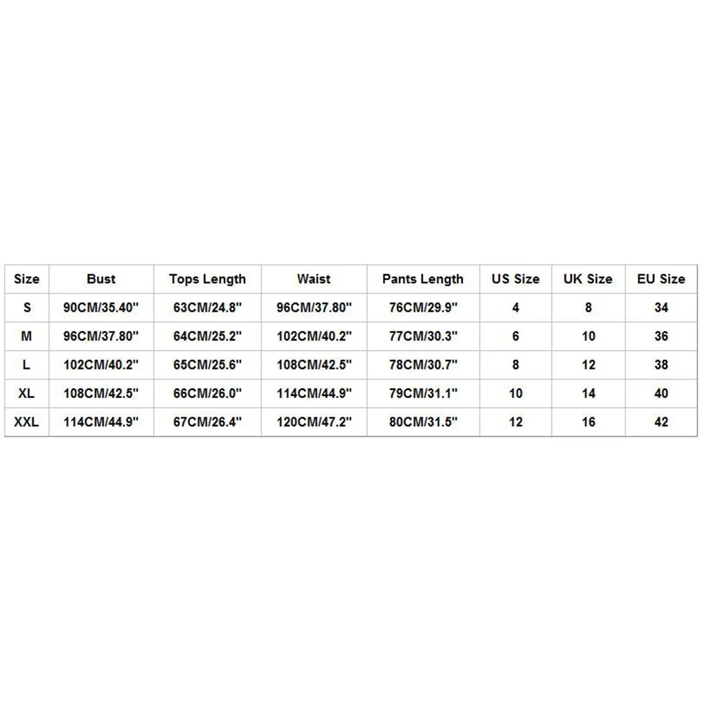 | Size | Bust | Tops Length | Waist | Pants Length | US Size | UK Size | EU Size |