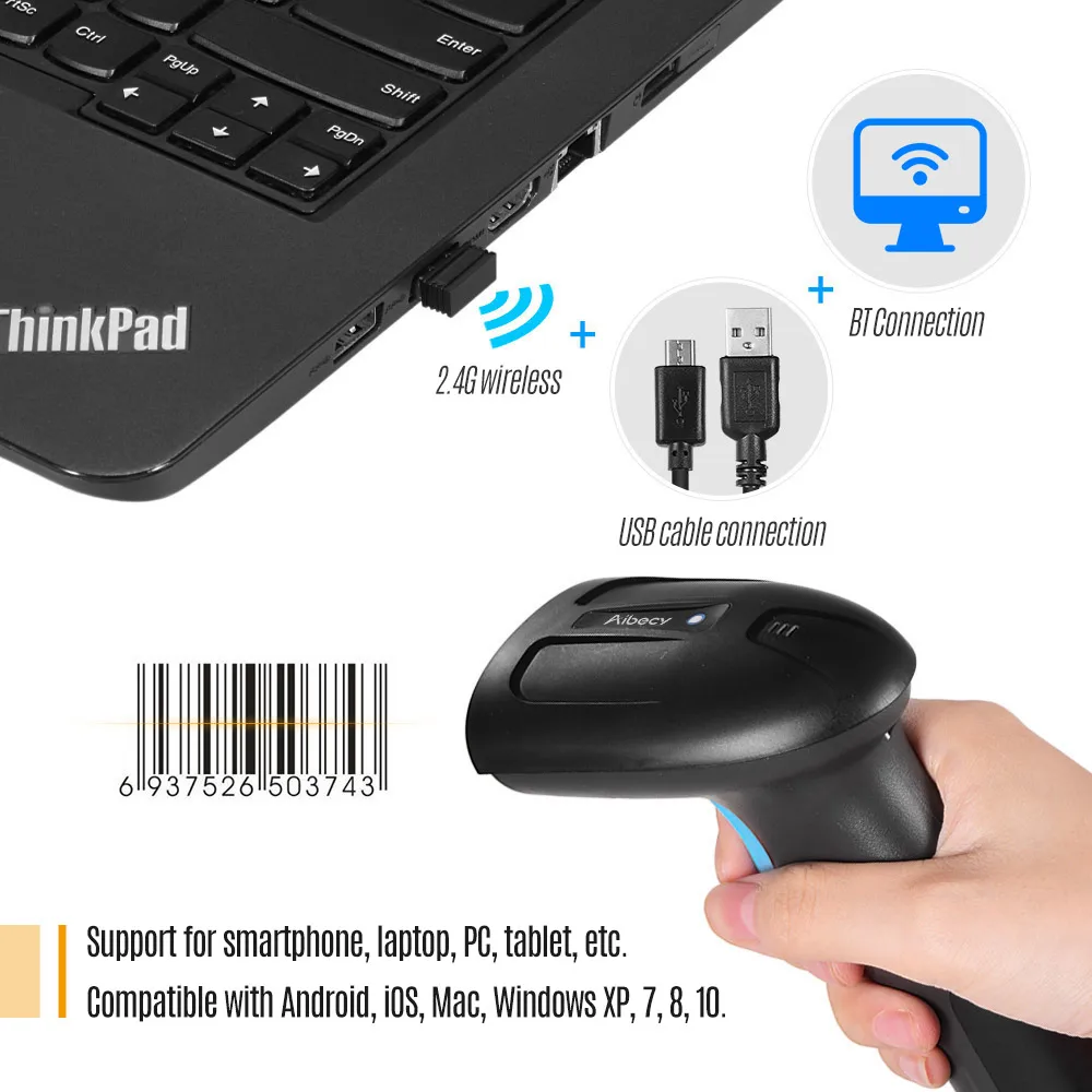 Поддержка подключения беспроводного/USB кабеля BT/2,4G, 3 режима для опции. Может сканировать 1D/2D штрих-коды на бумаге, пленке, мобильный телефон и экран компьютера, отличная способность декодирования.
