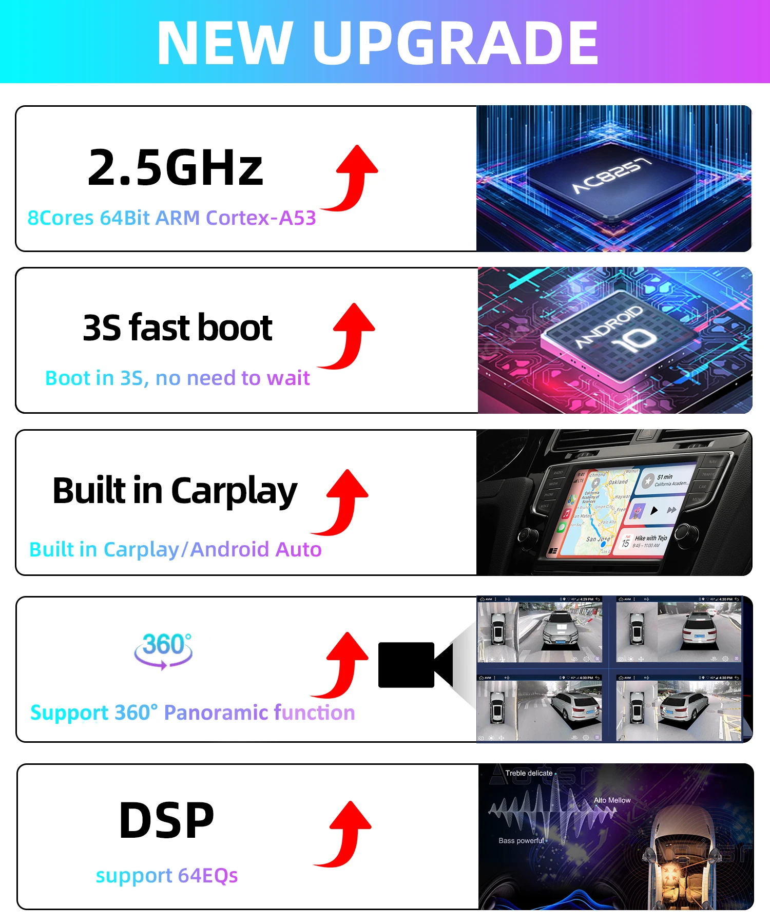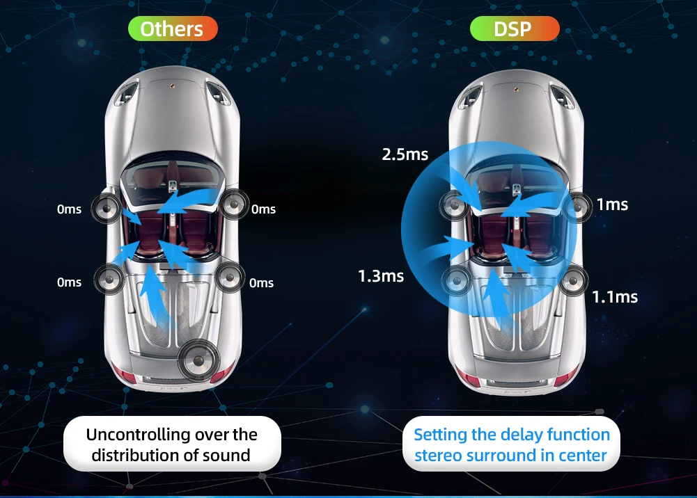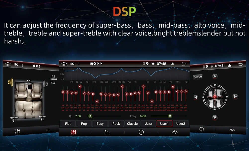 ● Цифровой DSP делает качество звука автомобиля лучше, чем раньше. Чип dsp AKM7388 + TDA7803. Качество звука намного лучше, чем в других версиях, другие бренды DSP, и коэффициент шумоподавления может достигать 115 дБ