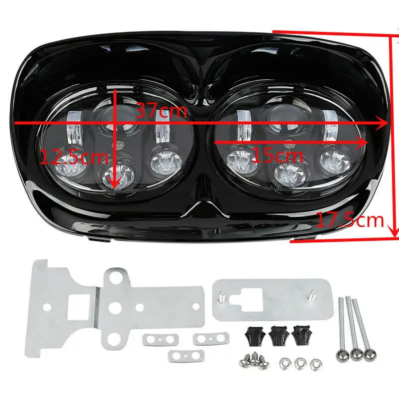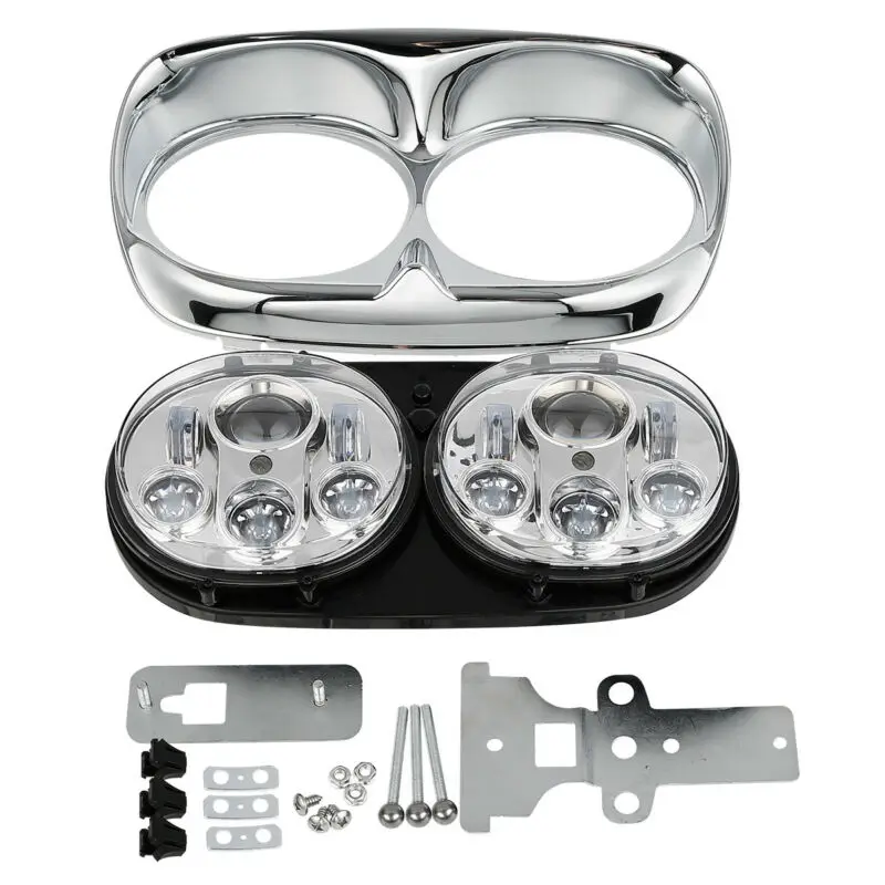 Подходит для 98-13 моделей дорожного скольжения. Ультра FLTRU Пользовательские FLTRX CVO Custom FLTRXSE2 CVO Road Glide Ultra FLTRUSE Дорожное скольжение FLTR Дорожное скольжение EFI FLTRI Посылка включает в себя: 1 комплект двойной светодиодный хромированный комплект для сборки фар