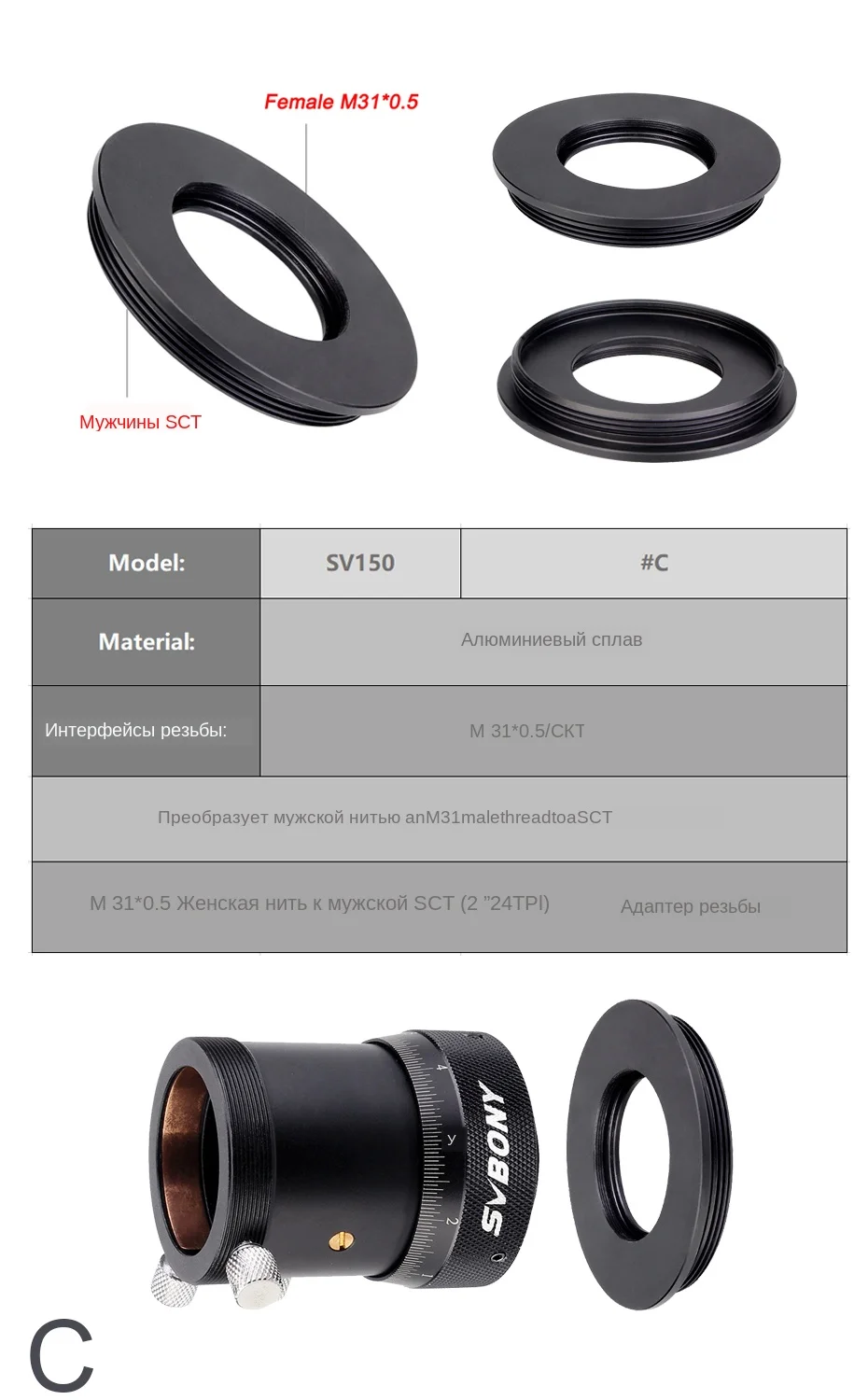 SVBONY M31 * 0,5 внутренняя резьба для SCT наружная резьба адаптер для 1,25 "двойной спиральный фокус