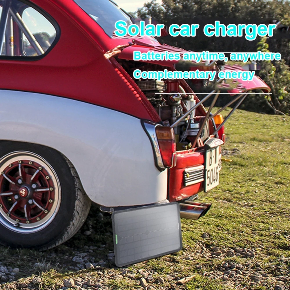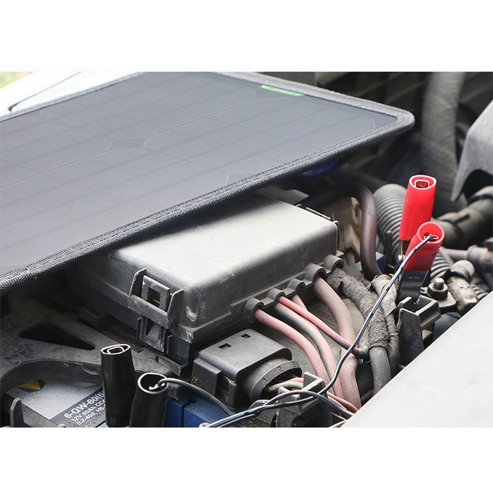 12V автомобиль с питанием от солнечных батарей Батарея Зарядное устройство является идеальным решением для зарядки аккумуляторов автомобилей, мотоциклов, автомобилей, снегоходов, тракторов, И т. Д. Через солнечную энергию, когда автомобиль находится в состоянии отключения электроэнергии и нехватки энергии, поддерживая эффект батареи и расширяя его объем жизни.