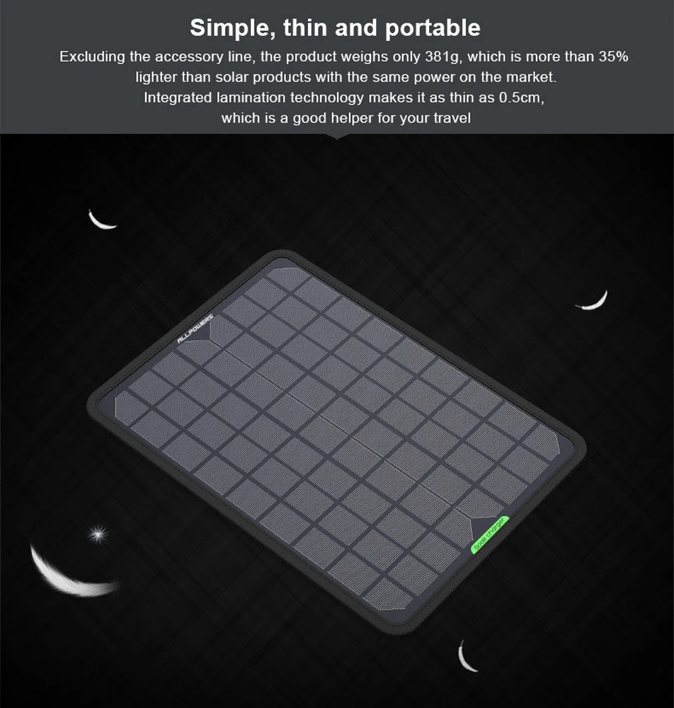 Солнечная панель прошла сертификацию FCC, RoHS, CE. Технология защиты от короткого замыкания и перенапряжения обеспечивает безопасность вашего устройства.