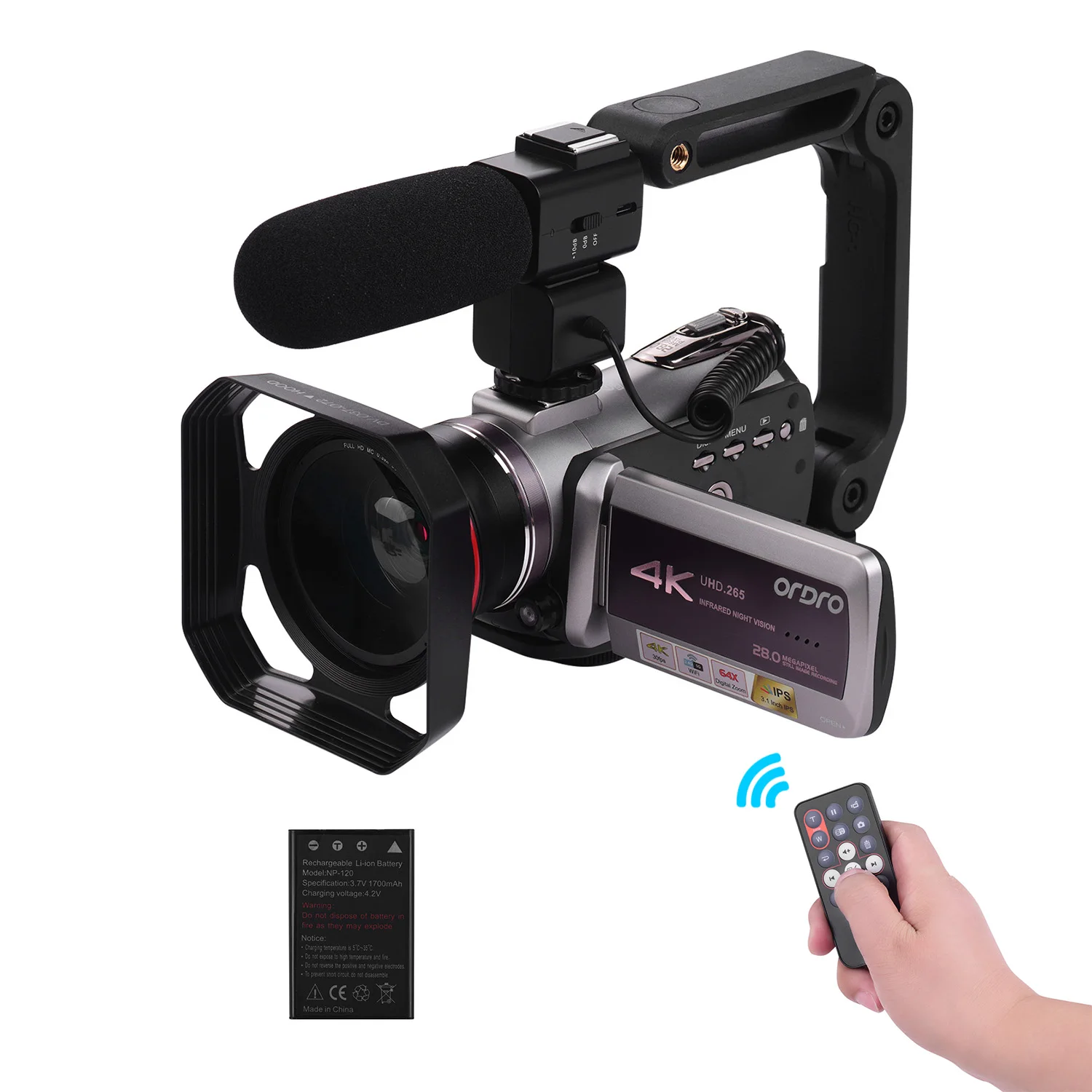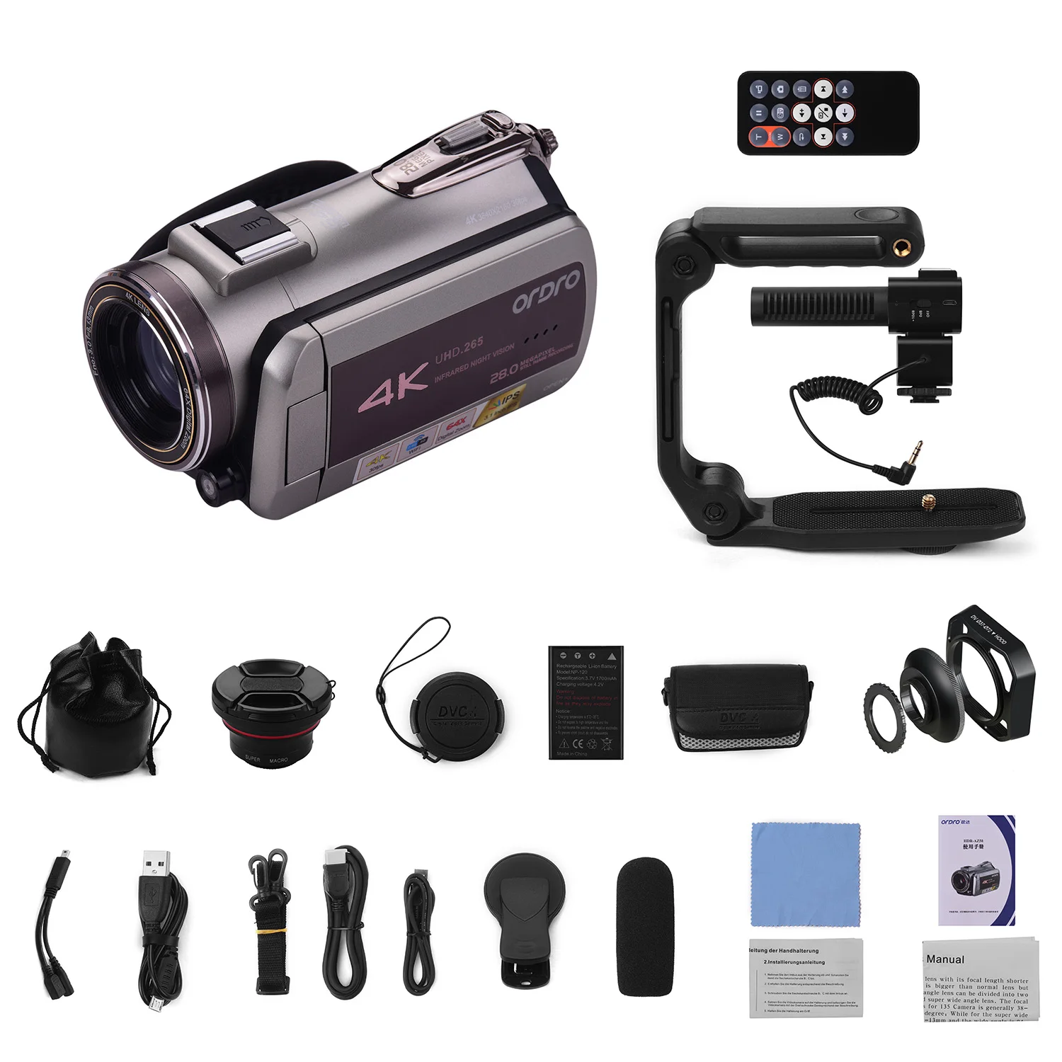 Wi-Fi подключение и ночное видение:Приложение ORDROКамера VFПреобразует ваш смартфон в пульт дистанционного управления камерой в режиме реального времени. Когда вы закончите запись, также очень легко загрузить записанные видео на свой смартфон и поделиться с Ins и Facebook. Ночное видение позволяет снимать четкое изображение 4K в темной среде (ИК-изображение черно-белое).
