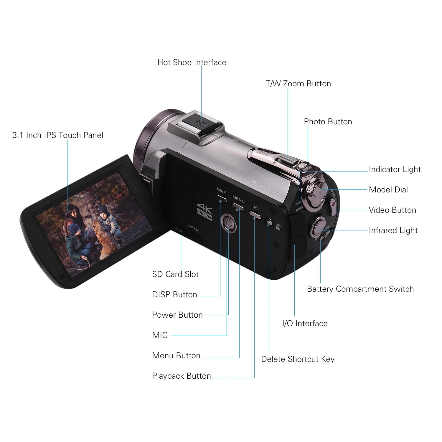 Стерео микрофон и широкоугольный объектив:Для стереомикрофона технология сбора звуковых помех с двойной зависимостью имеет широкое расстояние, широкую частоту и четкий звук. Эта видеокамера оснащена широкоугольным объективом 2 в 1 0,39x (с макрообъективом) для более широкого спектра съемки, если вам нужны снимки крупным планом, используйте макрообъектив.
