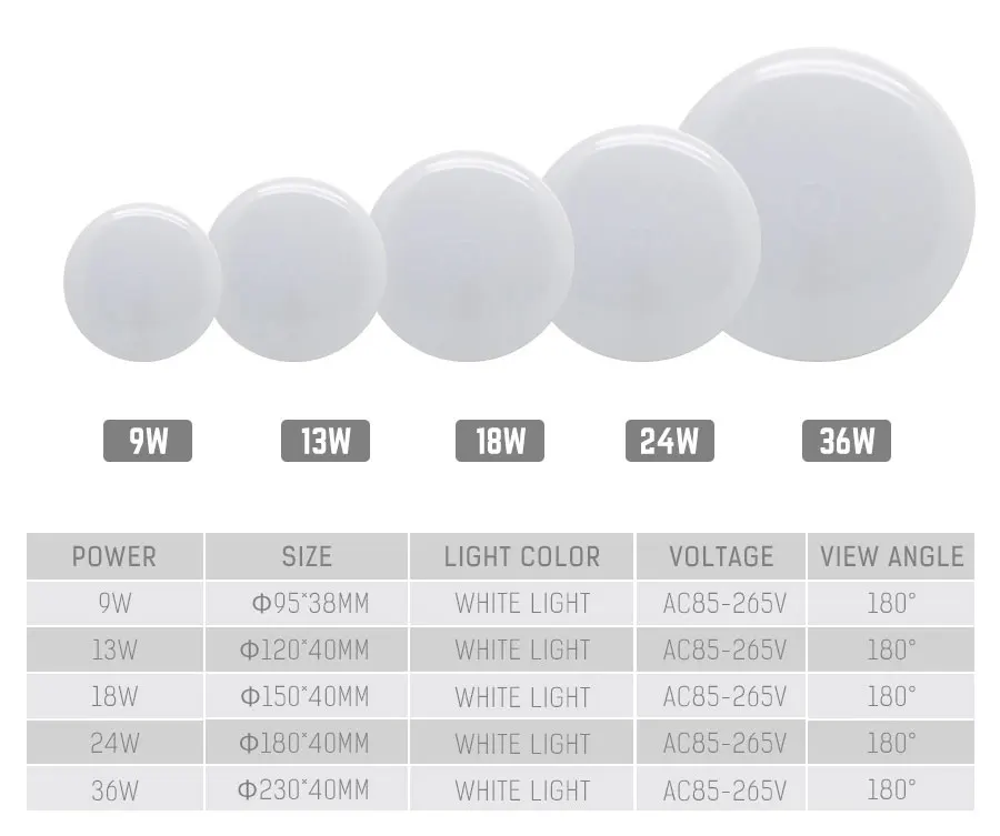 2.Этот продукт имеет 9 Вт/12 Вт/18 Вт/24 Вт/36 Вт и 85-265 в, это означает, что вам не нужно беспокоиться о том, может ли она использоваться в вашей стране, а также имеет холодный и теплый белый свет. Вы можете выбрать цвет в соответствии с вашими предпочтениями.