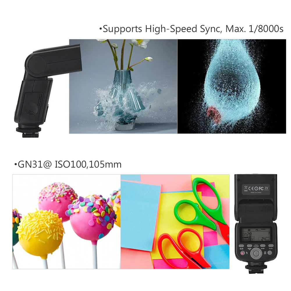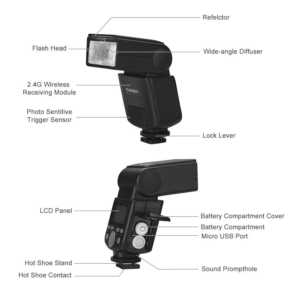 -Когда система звуковых подсказок включена, вспышка излучает различные звуки, чтобы указать различный рабочий статус; С помощью кнопки ZOOM, головка вспышки может циркулировать в диапазоне покрытия 24 мм-105 мм.
